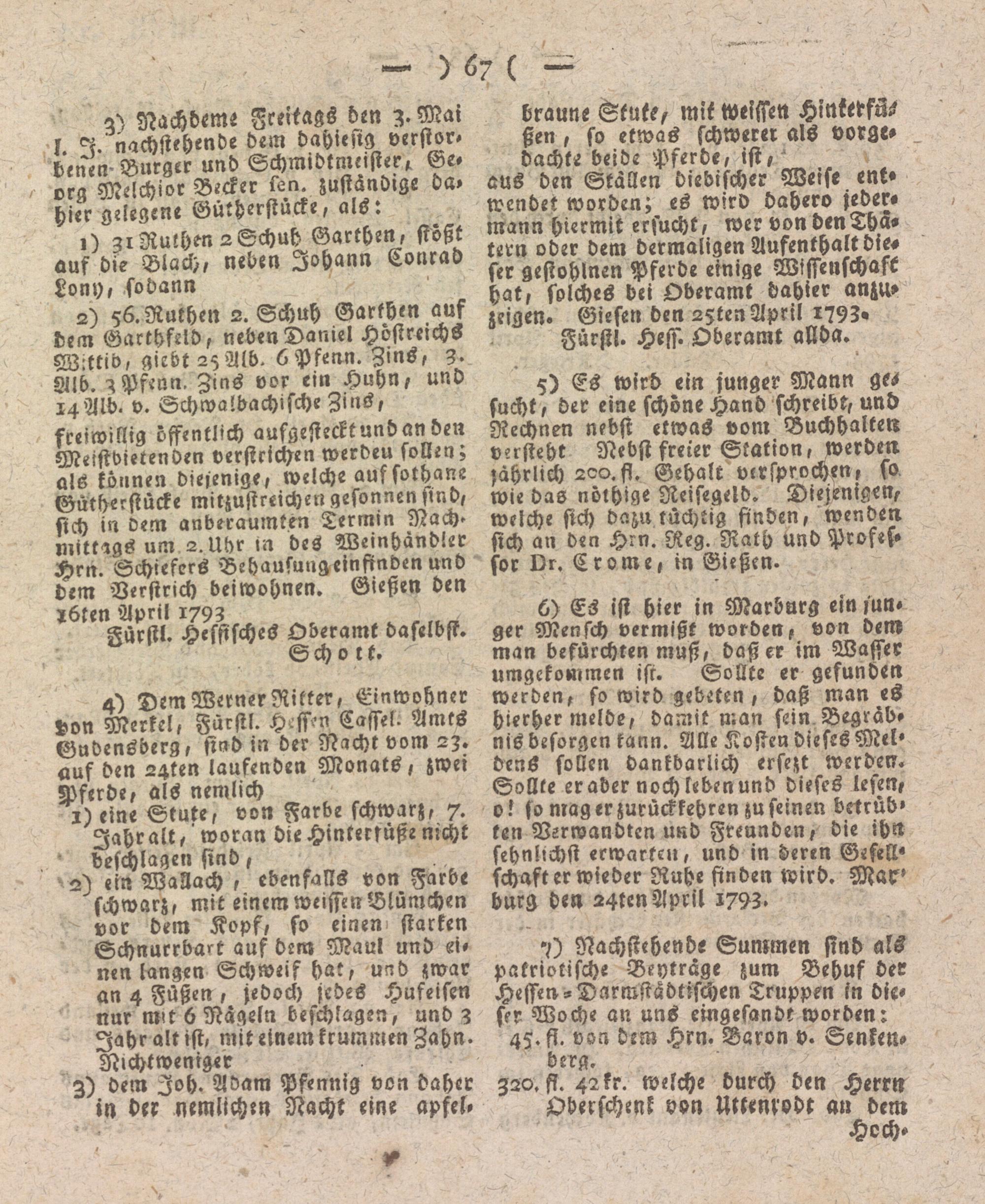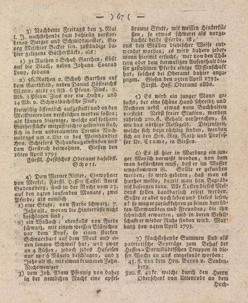 aus den Stallen diebischer Weise entwendet worden; es wird dahero jedermann hiermit ersucht, wer von denTba- tern oder dem dermaligen Aufenthalt dieser gestohlnen Pferde einige Wissenschaft hat, solches bei Oberamt dahier anzu- zeigen. Giesen den azten April 1793»