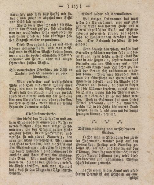 Bei einigen Oekonomen hat man wider die Kornwürmer, eine aus zwei Malter Asche von hartem Holze und a Viertel ungelöschten Kalk, auf Seifensiederartzubereitete Lauge, von ohnge- fähr io Wasserkannen bewährt gefunden. Der Gebrauch derselben ist folgender: