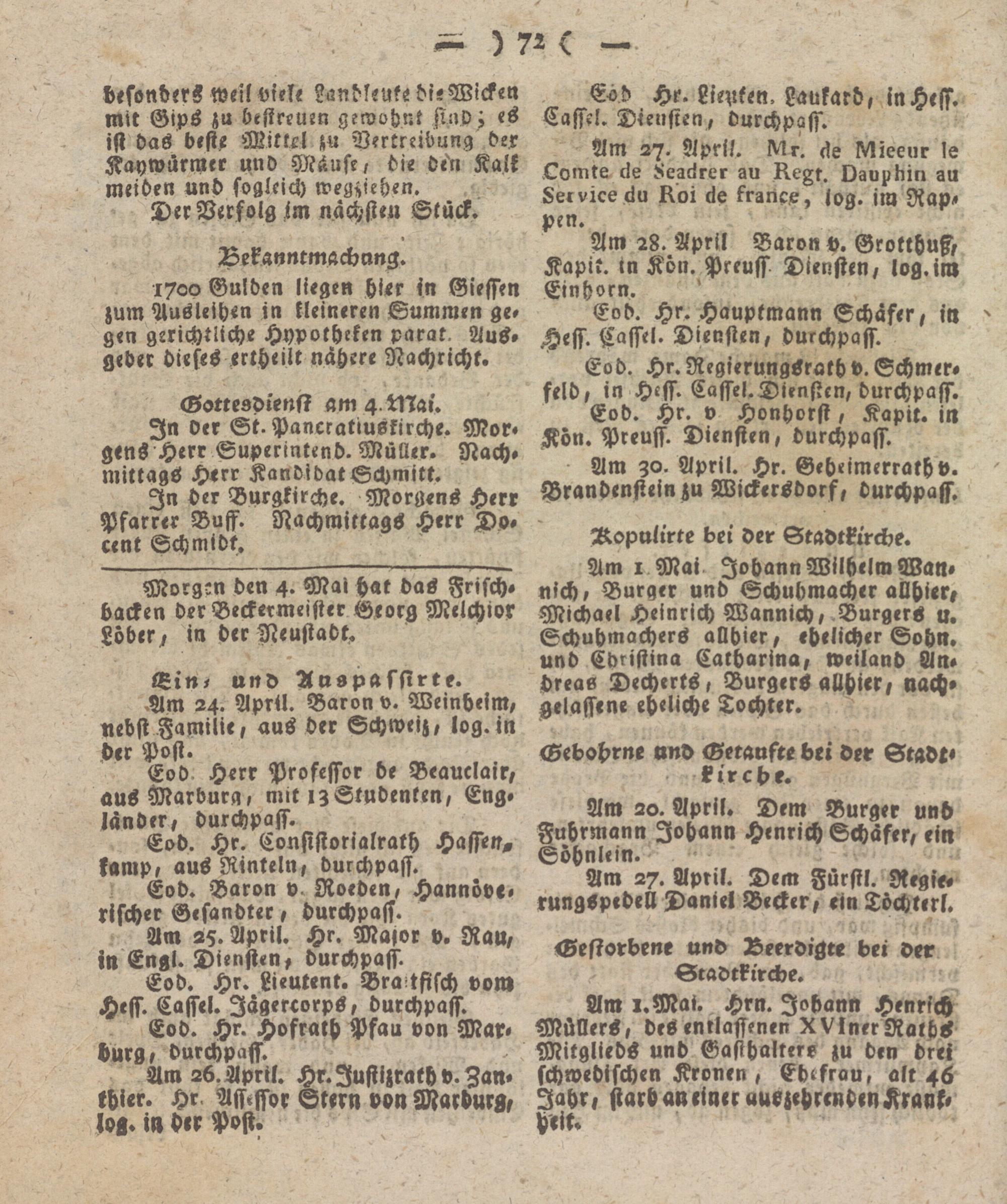 Am 28. April Baron v. Grotthuss, Kapit. in Kön. Preuss Diensten/ log.im Einhorn.