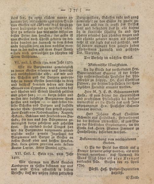 1) Da der Preis ber Milch auf 4 Kreuzer herunter gefezt worden, als wird hiermit, verordnet: daß Niemand die Maas Milch höher als vier Kreuzer verkaufen soll«. Giessen den 29. April 1794-