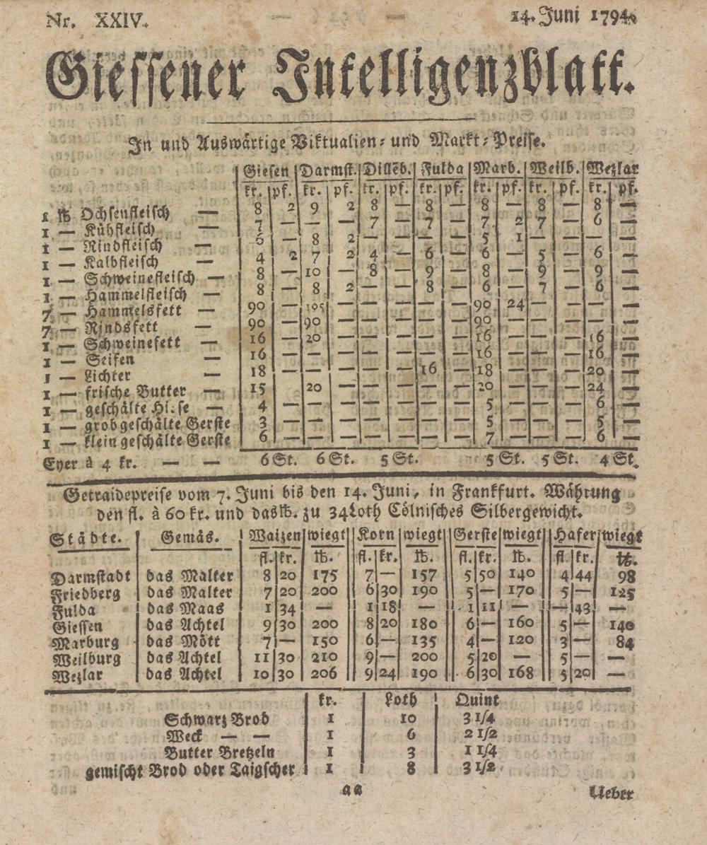 Getraidepreise vom 7. Juni bis den 14. Juni, in Frankfurt. Wahrung den fl. ä 62 kr. und daslb. zu Z4Loth Cölnisches Silbergewicht.