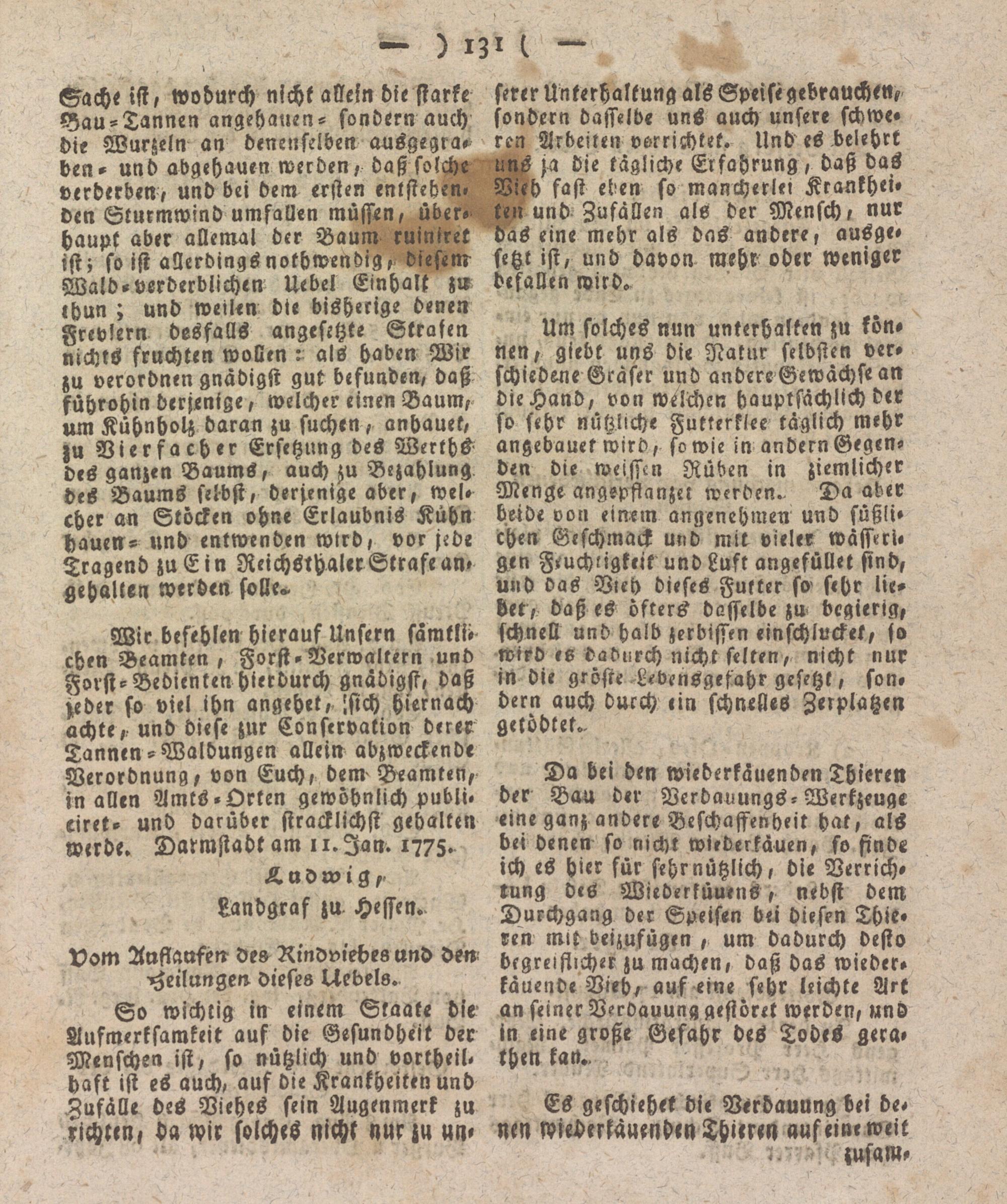 Wir befehlen hierauf Unfern samtlss chen Beamten, Forst-Verwaltern und Forst-Bedienten hierdurch gnädigst, daß zeder so viel ihn angehet,, lsich hiernach achte, und diese zur Conservation derer Tannen-Waldungen allein abzweckende Verordnung, von Euch, dem Beamten, in allen Amts-Orten gewöhnlich publi- eiret- und darüber stracklichst gehalten werde. Darmstadt am 11. Ian. 1775.