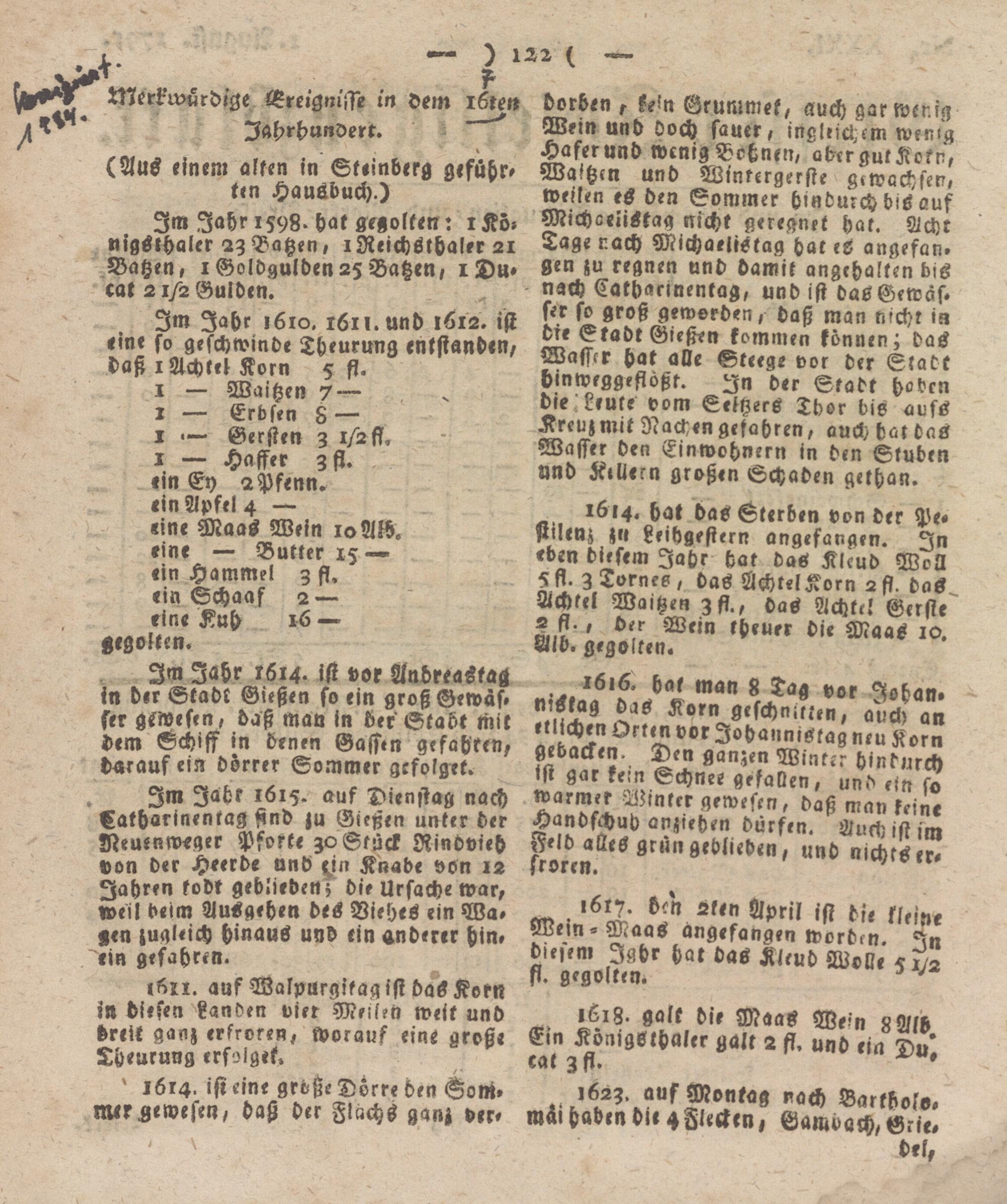 1614. hat das Sterben von der Pestilenz jn Leihgestern angefangen. In eben diesem Jahr hat das Kleud Woll 5st. Z Tornes, das ÄchtelKorn - st. das Achtel Waitzen Zfl., bas Achte! Gerste 2 st. , der Wein kheuer die Maas 10. Aid. gegolten.