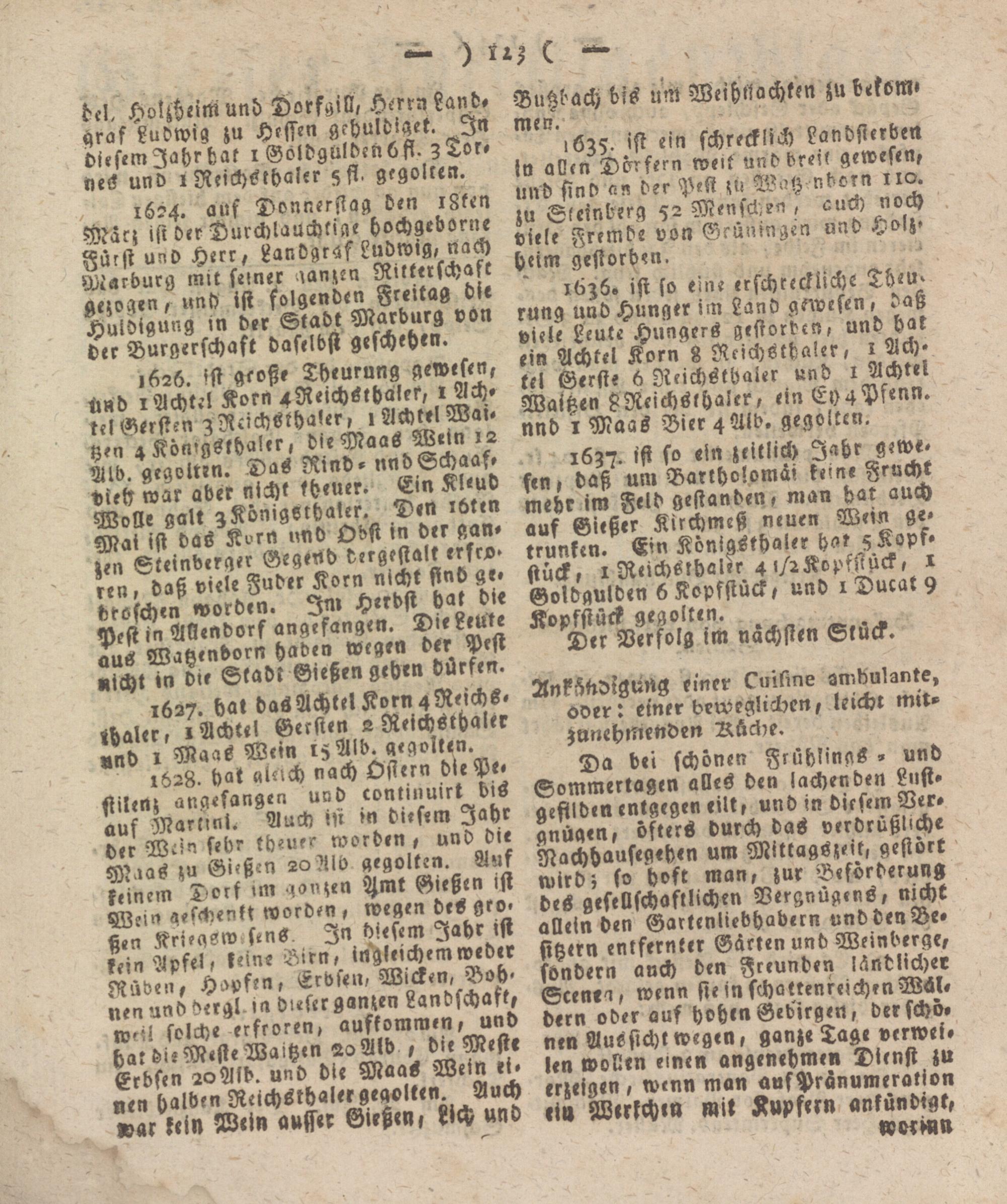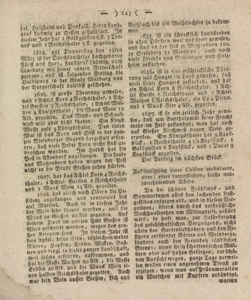 Kriegs» ftnö In diesem Jahr 'st f«in Apfel, keine Birn, in$it'.($ern,H5blt Rüden, Hopfen, (gtbien, 5Bi0ct#n'f?^/ tun und dergl 'n dieser ganzen Landschaft, »eil solche erfroren, aufkommen, und h^k dir Meste Waitzen 22 Alb , "Messe Erbsen 20Alb. und die Maas Wein eh «en halben Reichsthalergegolten Auch war hin Wein äusser Gießen, kiH und