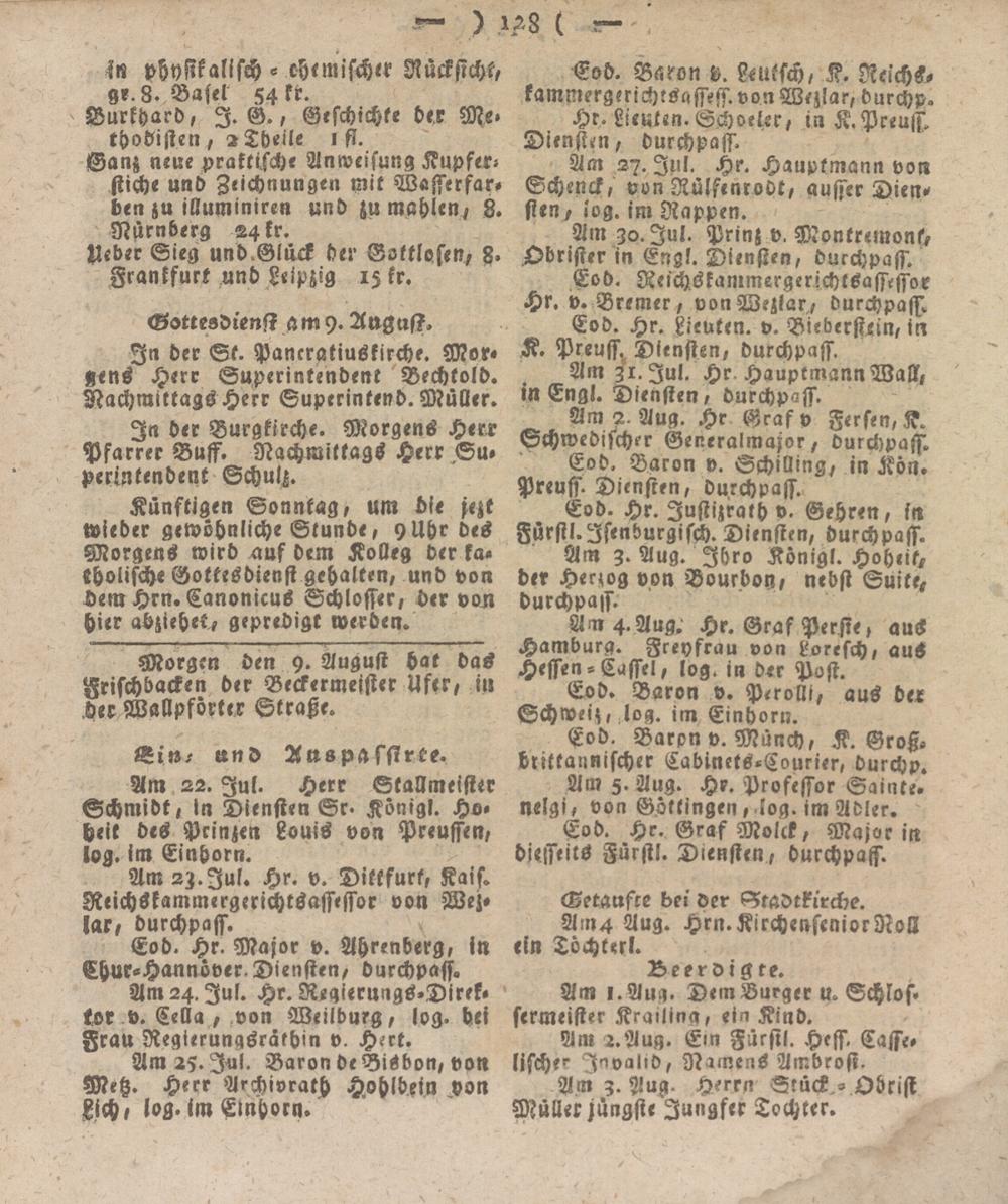 Am 4. Aug.' Hr. Graf Persie, aus Hamburg. Freyfrau von Loresch, au6 Hessen-Cassel, log. in der Post.