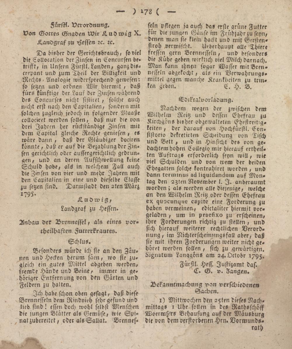 Nachdem wegen der zwischen dem Wilhelm Reitz und dessen Ehefrau zu Kirchgöns biöher obgewaltelen Ehestreitig, feiten , der darauf von Hochfürstl. Evn- sistorio dekretirten Scheidung von Tisch und Bett, und in Hinsicht de» von gedachtem hohen Eoüegio mir hierauf erteilten Auftrag» erforderlich fepn will, wie viel Schulden und von wem der beiden Ehegatten solche kontrahiret worden, und dann termmus ad liquidandum auf Montag den 2zken November l. I. anberaumt worden; als werden alle dieiellige, welche an den Wilhelm Reitz oder dessen Ehefrau ex; quocunque capite eine Forderung zu haben vermeinen, edictaliter hiermit vorgeladen , um in praefixo zu erscheinen, ihre Forderungen richtig zu stellen, und sich hierauf weiterer rechtlichen Verordnung, im Nichterscheinnngsfall aber, daß sie mit ihren Forderungen weiter nicht gehöret werden sollen, sich zu gewärtigen. Signatum LanqgönS am Lg.Octobr 1795.