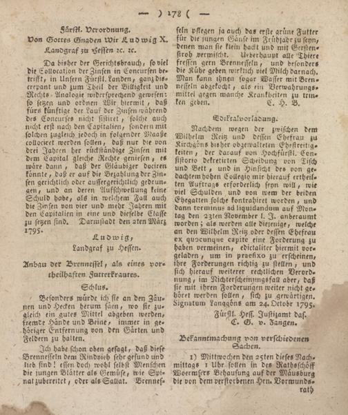 Da bisher der Gerichtsbrauch, soviel die Collvcation der Zinsen in Concursen de» trifft, in Unfern Fürsil. Landen, ganzdis- crepant und zum Theil der Billigkeit und Rechts-Analogie widersprechend gewesen: so setzen und ordnen Wir hiermit, daß fürs künftige der Lauf der Zinsen während des Concursss nicht sistiret, solche auch nicht erst nad; den Kapitalien/ sondern mit solchen zugleich jedoch in folgender Maaße collociret werden sollen, daß nur die von drei Jahren her rückständige Zinsen mit dem Capital gleiche Rechte geniesen, e« wäre dann, daß der Gläubiger dvciren könnte, daß er auf die BezahlungdcrZin- fen gerichtlich oder aussergerichtlich gedrungen, und an deren Aufschwellung keine Schuld Hobe, als in welchem Fall auch die Zinsen von vier und mehr Jahren mit den Capitalien in eine und dieselbe Elaste zu setzen sind. Darmstadt den 2ten März I79S-