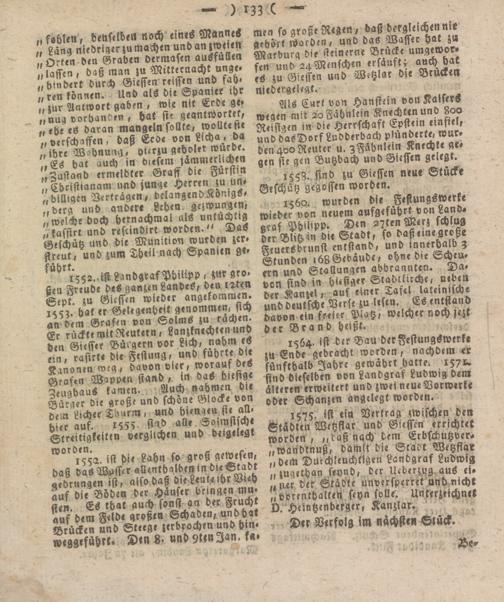 1575: ist ein Vertrag zwischen den Städten Wetzflar und Giessen errichtet worden, „raß nach dem Erbschutzver- „wandtnuß, damit die Stadt Wetzflar „dem Du'chkruchtlgen Landgraf Ludwig „zugethan seynd, der Ucberz,ug aus ei. ner der Städte unversperret und nicht „vorenthalteN seyn solle'. Unterzeichnet 0. Hejntzenberger, Kanzlar.