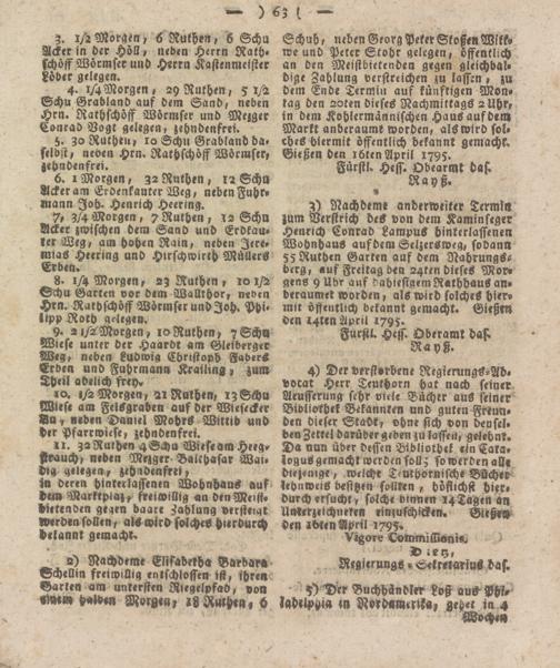 3) Nachdemr anderweiter Lermln zum Verstrich deS von dem Kaminfeger Henrich Conrad Lampus hinterlassenen Wohnhaus aufdem SelzerSweg, sodann 55 Ruthen Garten auf dem Nahrungö- berg, auf Freitag den 24ken dieses Mor« gen« 9 Ubr auf dahiestgemRathhaus an» beraumet worden, alswird solches hier» mir vffenrUch bekannt gemacht. Gießm den I4tcn April 179$.