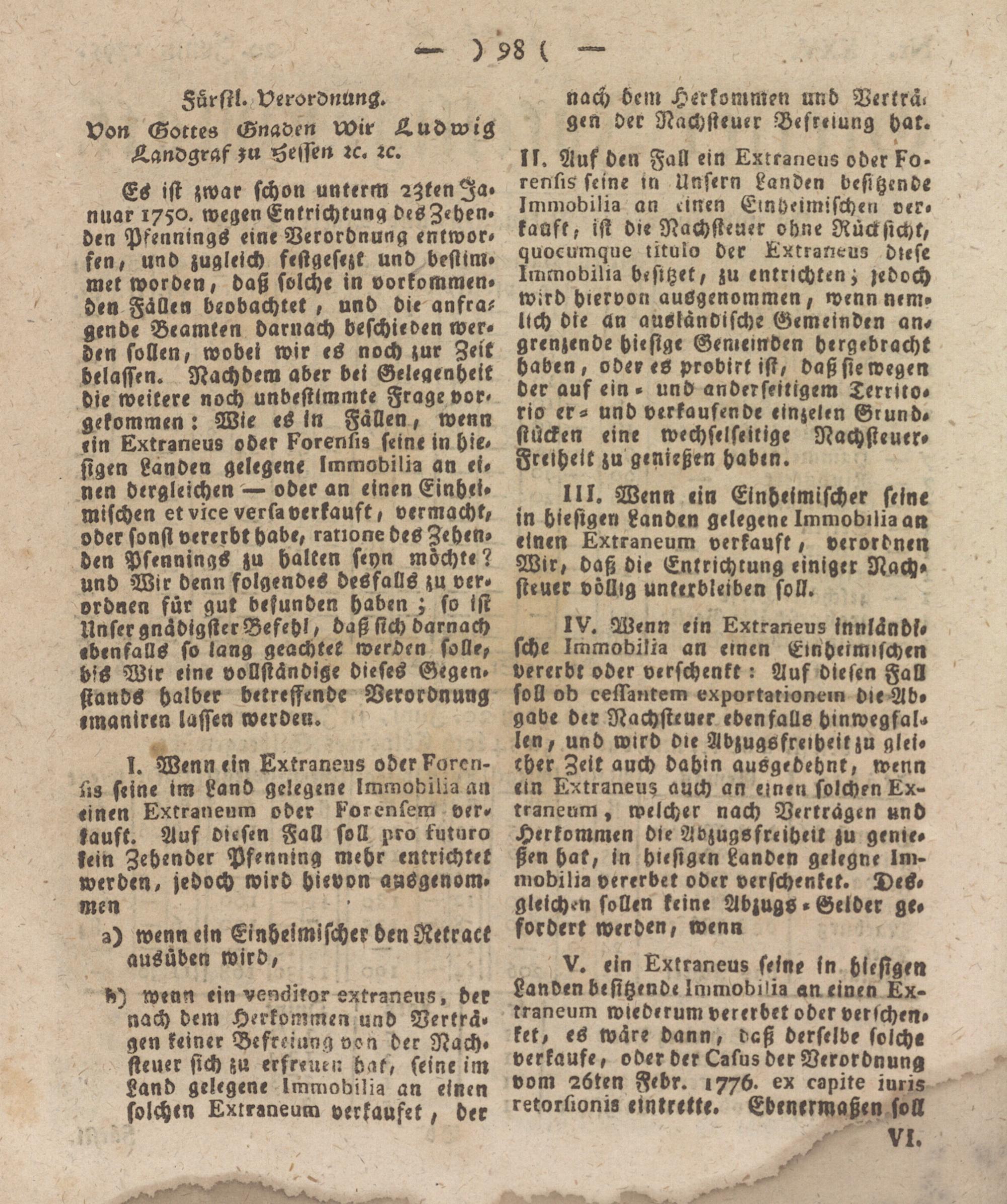 III, Wenn «in Einheimischer sein« in hiesigen Land«» gelegene Immobilia an einen Extraneum verkauft, verordnen Wir, daß die Entrichtung einiger Nachsteuer völlig unterbleiben soll.