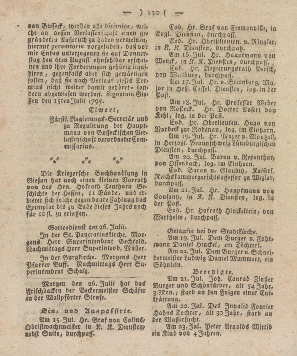 von Busseck, werden alle diejenige, rocl, che an dessen Verlassenschasr einen ge, gründeten Anspruch zu haben vermeinen, hiermit peremcorie vorgeladen, daß vor mir Endes unterzogenen sie auf Donner» stag den 6ten August ohnfehlbar esschei» nen und ihre Forderungen gehörig liqui» Viren, gegenfalls aber sich gewärtigen sollen, daß sie nach Verlauf dieses Ter» mins nicht weiter damit gehöret- son» Vern abgewiesen werden. Signatum ßen den iztenJulii 1795.