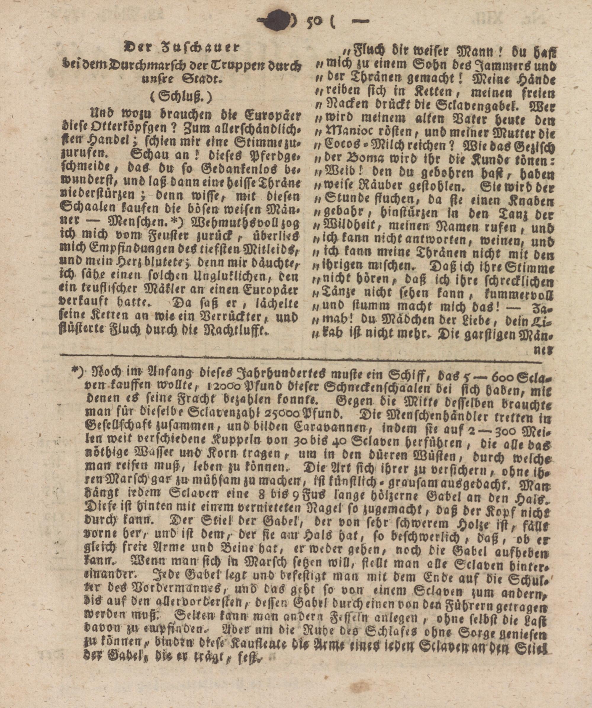 *) Noch im Anfang dieses JahrhunberteS must« «in Schiss, das < — 6oo&da* ven kaussen wollte, 12200 Pfund dieser Schneckenschaalen bei sich haben, mir - denen es seme Fracht bezahlen konnte. Gegen die Mitt« desselben brauch « man für dieselbe Sclarenzahi 25202 Pfund. Die Menschenhändler trettenia Gesellschaft zusammen, und bilden Caravannen, indem sie auf 2 —200 J0?«i. l«n wett verschiedene Kuppeln von zcrbis 40 Sklaven herführen , bi« all« das «othige Wasser unh Korn tragen, um in den dürren Wüsten, durch welch« man reifen muß, leben zu können. Die Art sich ihrer zu versichern, ohne ch. ren Marsch gar zu mühsam zu machen, ist künstlich. grausam ausgedacht. Man. dä^ßkirdE Sclaven ein« 8 bis9Fus länge hölzerne Gabel an den Hals Diese ist hinten mit einem vernieteten Nagel so zugemacht, Laß der Kovf nich» durch kann. Der Stiel- der Gabel, der von sehr schwerem Holze ist, fälle vorne her, und ist dem,- der sie am Hals hat, so beschwerlich, daß , ob er- gleich frei« Arme und Beine har, er weder gehen, noch die Gabel aufbebew kann. Wenn man sich in Marsch setzen will, stellt man alle Sclaven hinter, rmander. Jede Gabel legt und befestigt man mit dem Ende auf Vie Schur.' des Vordermannes, uNV das gehr so von einem Sclaven zum andern.