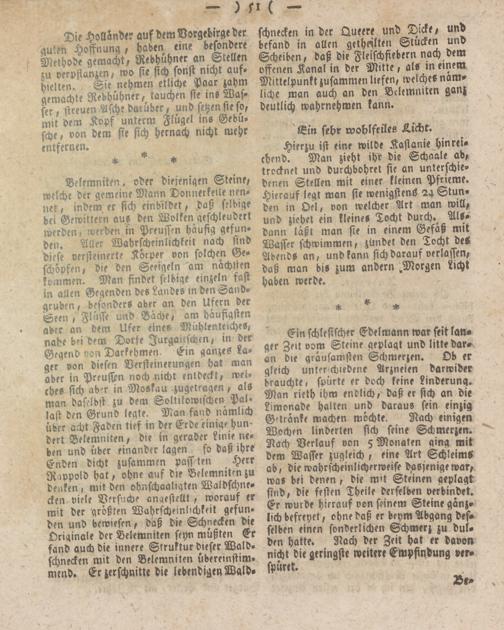 Belemniten. oder diejenigen Steine, welche der gemeine Mann Donnerkeile nennet , indem er sich einbildet, daß selbige bei Gewittern aus den Wolken geschleudert werden, werden in Preussen häufig gefunden. Atter Wahrscheinlichkeit nach sind diese versteinerte Körper von solchen Geschöpfen, die den Seeigeln am nächsten kommen. Man findet selbige einzeln fast in allen Gegenden des ?airdes in den Sandgruben , besonders aber an den Ufern der Seen, Flüsse und Bache, am häufigsten aber an dem Ufer eines Mühlenteiches, nahe bst dem Dorfe Iurgaüfchen, in der Gegend von Darkehmen. Gin ganzes Lager von diesen Versteinerungen hat man aber in Preussen noch nicht entdeckt, welches sich ab'-r in Moskau -zugetragen, als man daselbst zu dem Soltikowischen Pal- last den Grund legte. Man fand nämlich über acht Faden tief in der Erde einige hundert Belemniten, die in gerader Linie neben und über einander lagen so daß ihre Enden dicht zusammen passten Herr Rippold hat, ohne auf die Belemniten zu denken, mit den ohnschaaliqten Waldschne- cf en viele Versuche anaestellt , worauf er mit der größten Wahrscheinlichkeit gefunden und bewiesen, daß die Schnecken die Originale der Belemniten seyn müßten Er fand auch die innere Struktur dieser Waldschnecken mit den Belemniten übereinstim. wend. Er zerschnitte die lebendigen Wald-