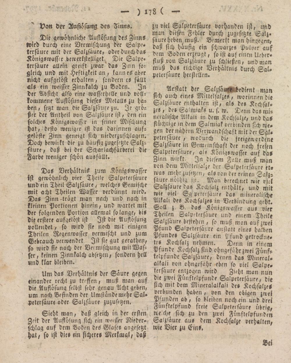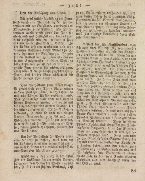 Das Verhältnis zum Königswasser ist gewöhnlich vier, Theile Salpetersäure und ein Theil Salzsäure / welches Gemische mit acht Theilen Wasser verdünnt wird. Da- Zinn-trägt man nach und nach in kleinen Portionen hinein/ und wartet mit der folgenden Portion allemal solange, bis die erstere aufgelöst ist Ist die Auflösung vollendet , so wird sie noch mit einigen Theilen Regenwasser vermischt und zum Gebrauch verwendet Ist sie gut gerathen, so wird sie nach der Beimischung mit Wasser, keinen Zinnkalch absetzen, sondern hell und klar bleiben.