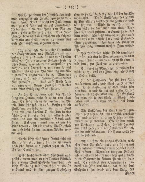 eben so zu Werke geht, wie bei der im Königswasser. Diese Auflösung des Z nnS in Vitriolsaure löset sehr viel Zinn aut und hält sich gut. Wird sie von dem vielen Zinn dick , so darf man nur einige Tropfen Vitrivlöl zusetzen, wodurch sie wieder Helle wird. Sie löset immerfort Zinn auf, ohne daß man nöthig hat, noch Salpetersäure zujusitzen. So habe ich sichvzehn Wochen lang ununterbrochen Zinn aufgelöst.