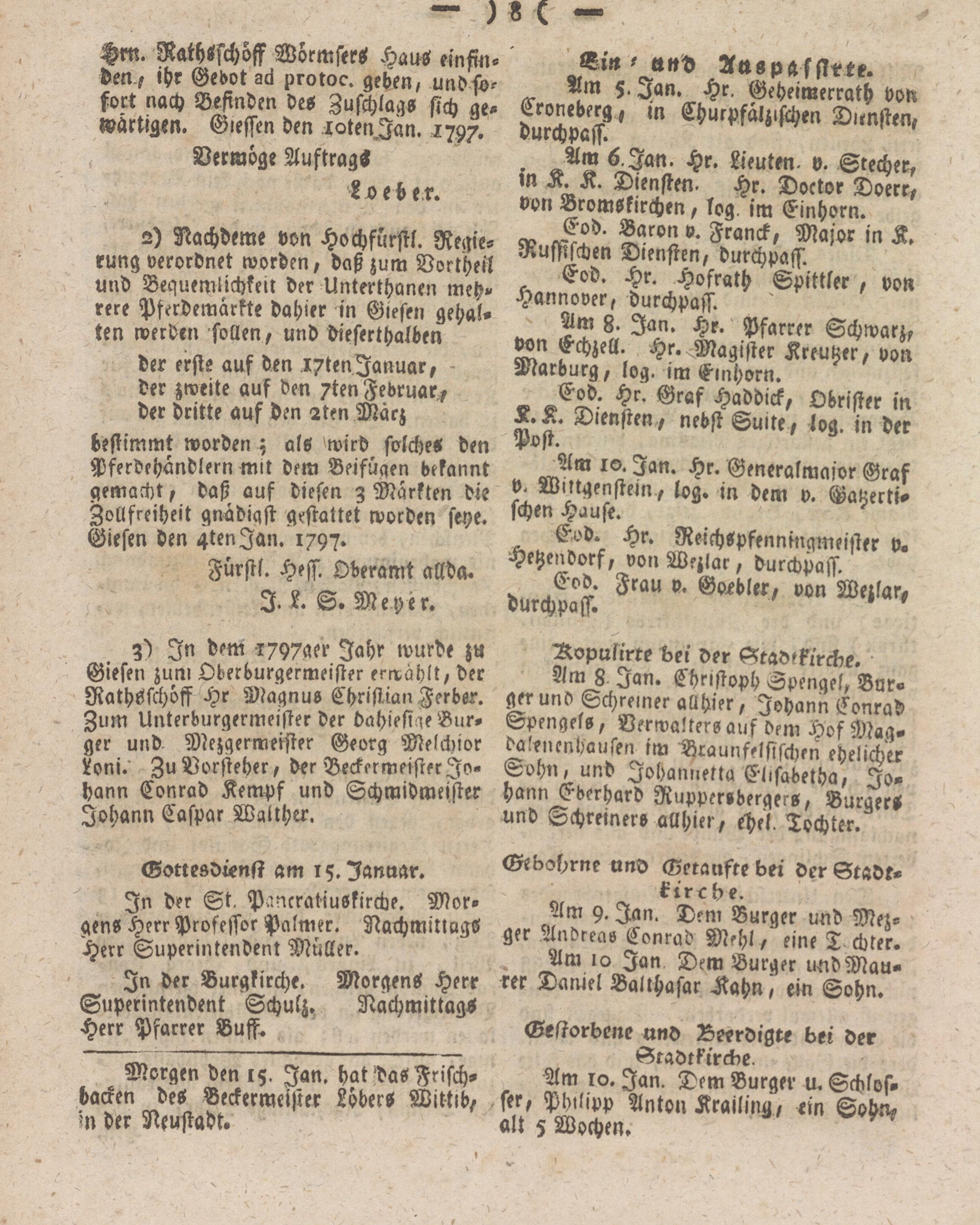 Am 8» Jan. Hr. Pfarrer Schwarz, von Echzell. Hr.,Magister Kreutzer, von Marburg, log. im Einhorn.