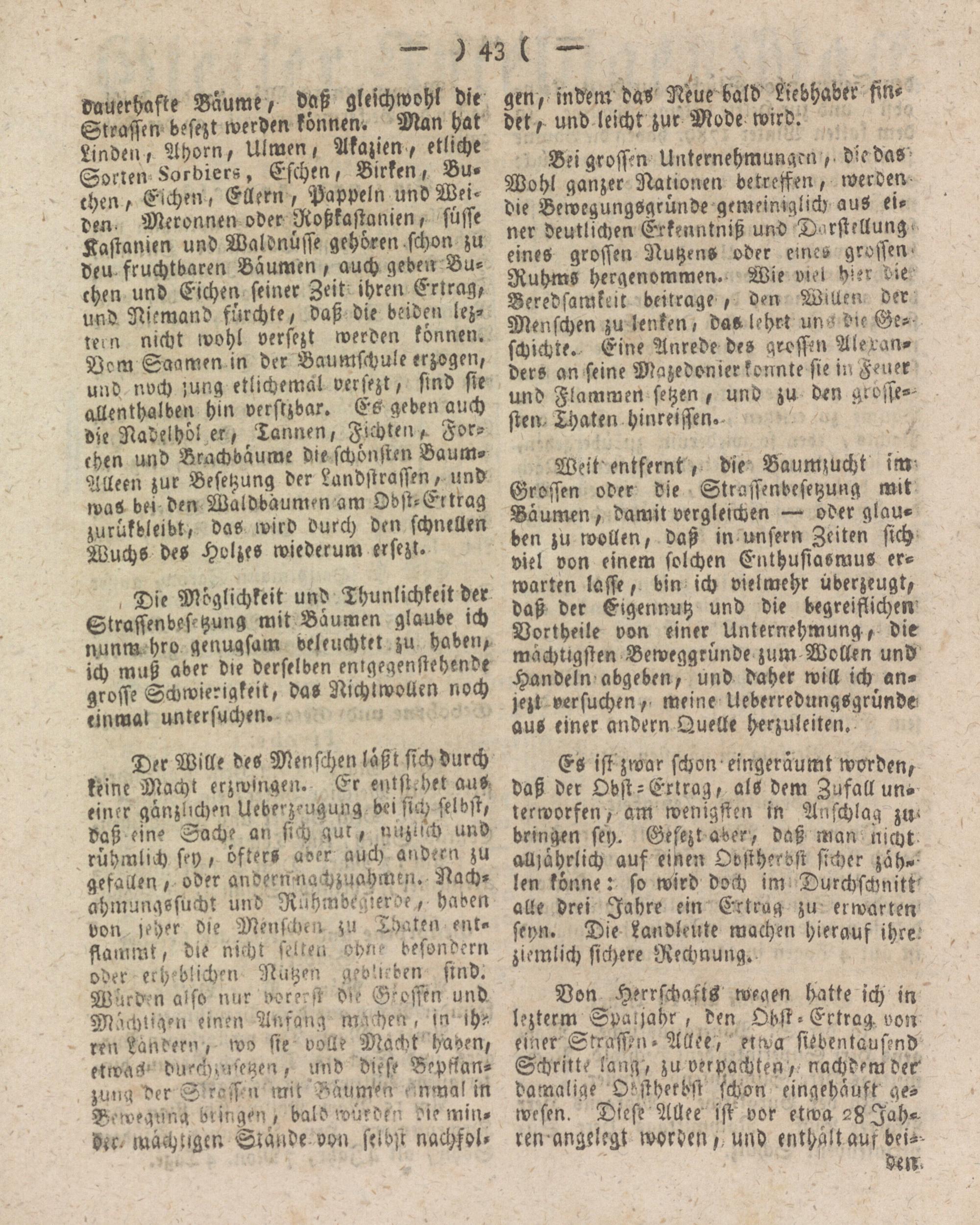 Der Wille des Menschen laßt sich durch keine Macht erzwingen. Er entst.het auS einer gänzlichen Ueberjeugung bei sich selbst, daß eme Sache an sich gut, nuzuch und rühmlich ffy, öfters aoer auch andern zu gefallen, oder andern nachzuahmcn. Nachahmungesucht und Ruhmbegierde, haben von «eher Die Menschen zu Thaten entflammt, die nicht selten ohne besondern oder erhchlichen Nutzen gebli-ben sind. Würden also nur vorerst 6«e Grossen und Mächtigen einen Anfang mächen, in ihr ren Landern, wo sie volle Macht haben, etwa?! durch.--netzen - und diese Bepflanzung der Strassn mit 'Baumen • nmal in Bewegung bringen , bald würden ?ie mhu der. mächtigen Stände von selbst Nachfol