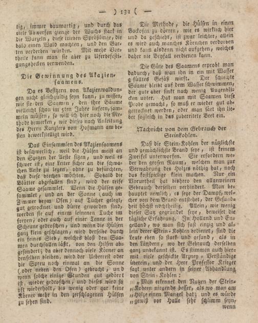 Da es Besitzern von Akazienwaldun- oen nicht gleichgültig feyn kann, zu wissen, wie sie den Saamen , den ihre Baume vielleicht schon im Sten Jahre liefern,sammeln müssen, so will ich hier noch die Methode bemerken, wie dieses nach Anleitung de» Herrn Kanzler» von Hofmann am besten bewerkstelligt wird.