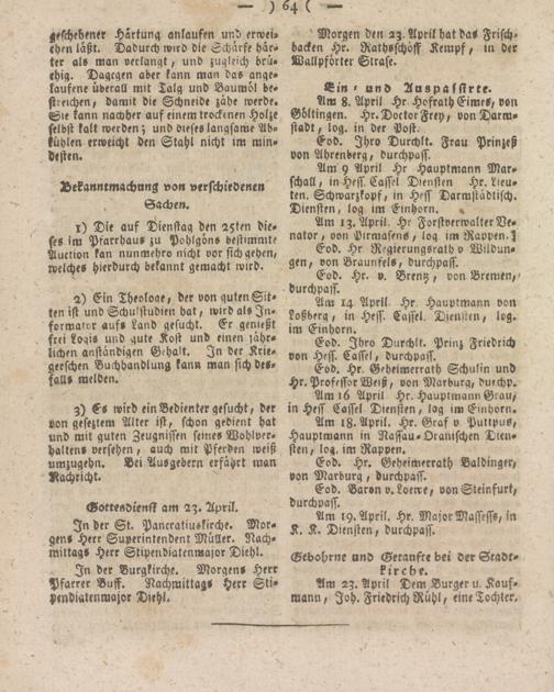 Am 14 April Hr Hauptmann von Loßberq, in Hess. Cassel. Diensten, leg. im Einhorn.