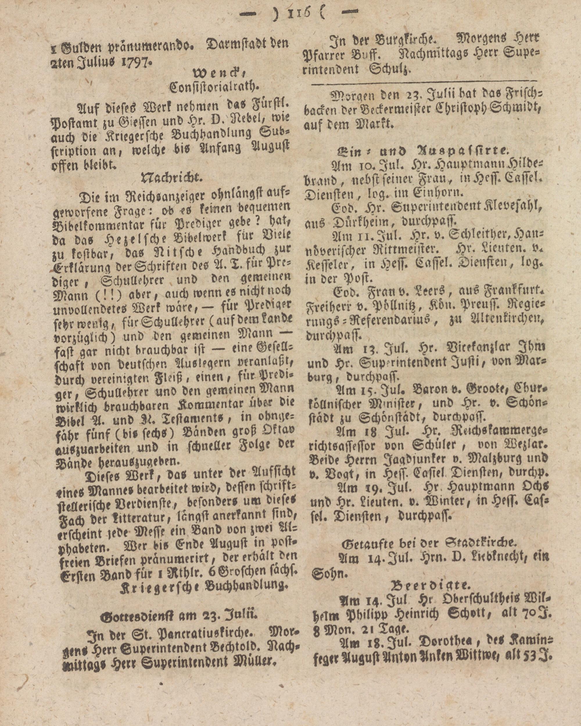 Am 11. Jul. Hr. v. Schleither, Hannöverischer Rittmeister. Hr. Lieuten. v. Kesseler, in Hess. Cassel. Diensten, log. in der Post.