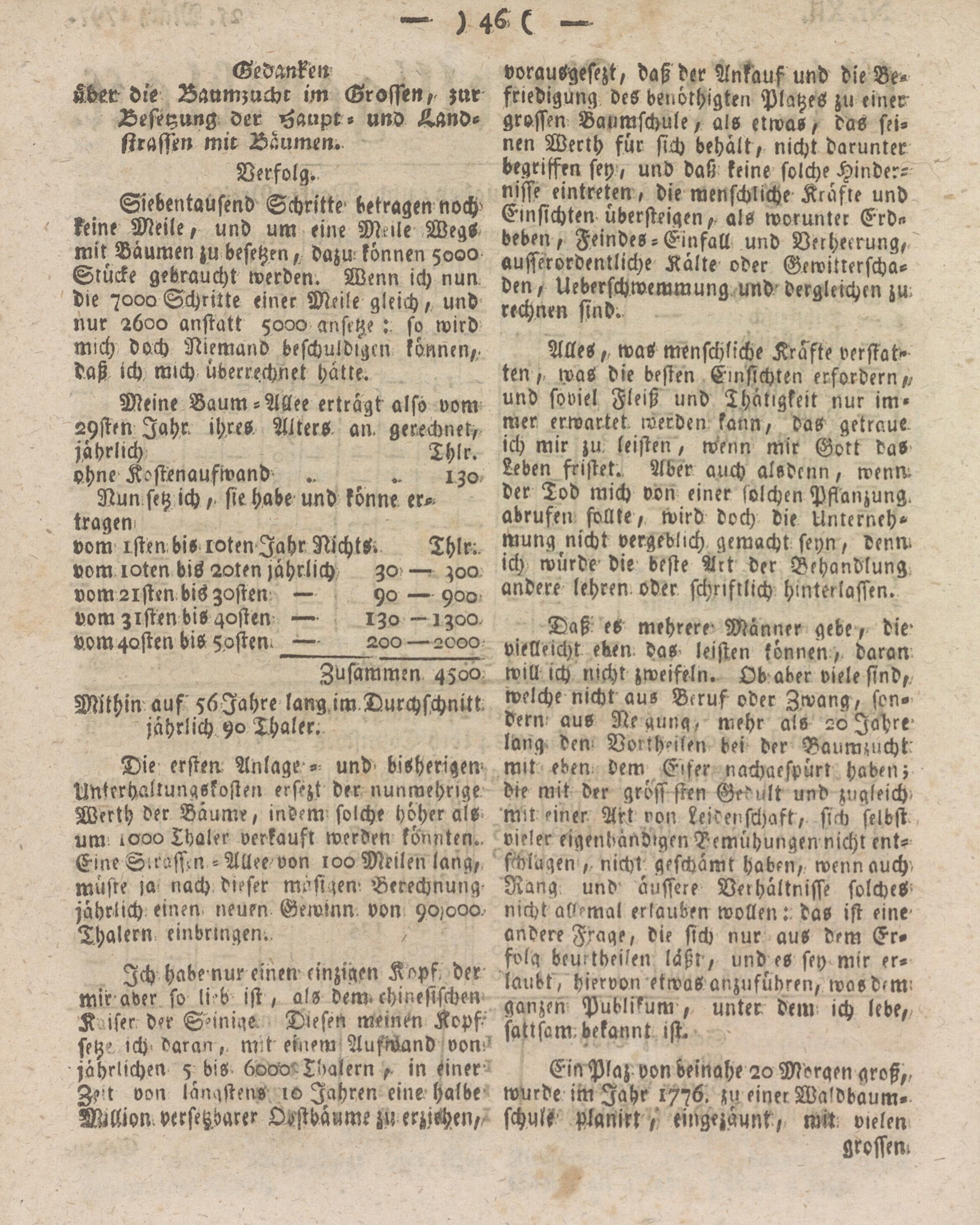 Die ersten Anlage - und bisherigen Unterhaltungskosten erftzt der nunmehrige Werth der Bäume, indem solche höher als um 1000 Lhaler verkauft werden könnten.. Eine Sirassn - Allee von 100 Meilen lang, müfte >a nach dieser masigen' Berechnung- jährlich einen neuen Gewinn, von 90,000. Thalern einbringen. ;