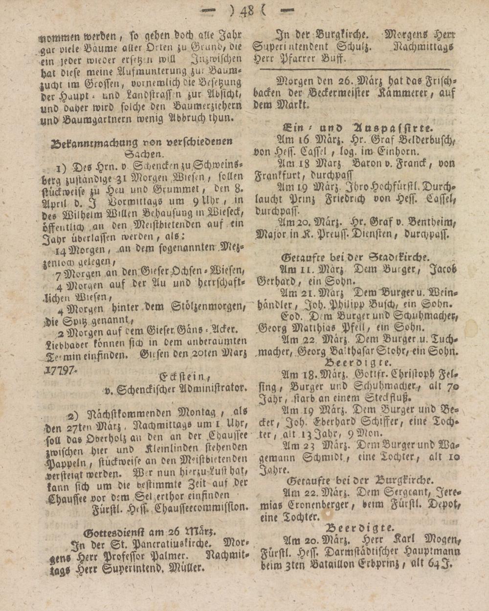 Am 20. Marz. Hr. Graf v. Bentheim, .Major in X Preuss. Diensten, durchpaff.