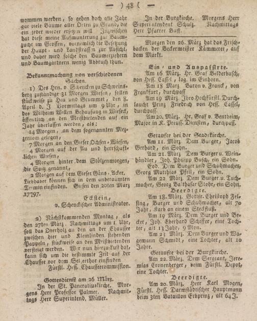 Am 20. Marz. Herr Karl Mögen, Fürstl. Hess. Darmstädtischer Hauptmann beim Sten Bataillon Erbprinz, alt 64I.
