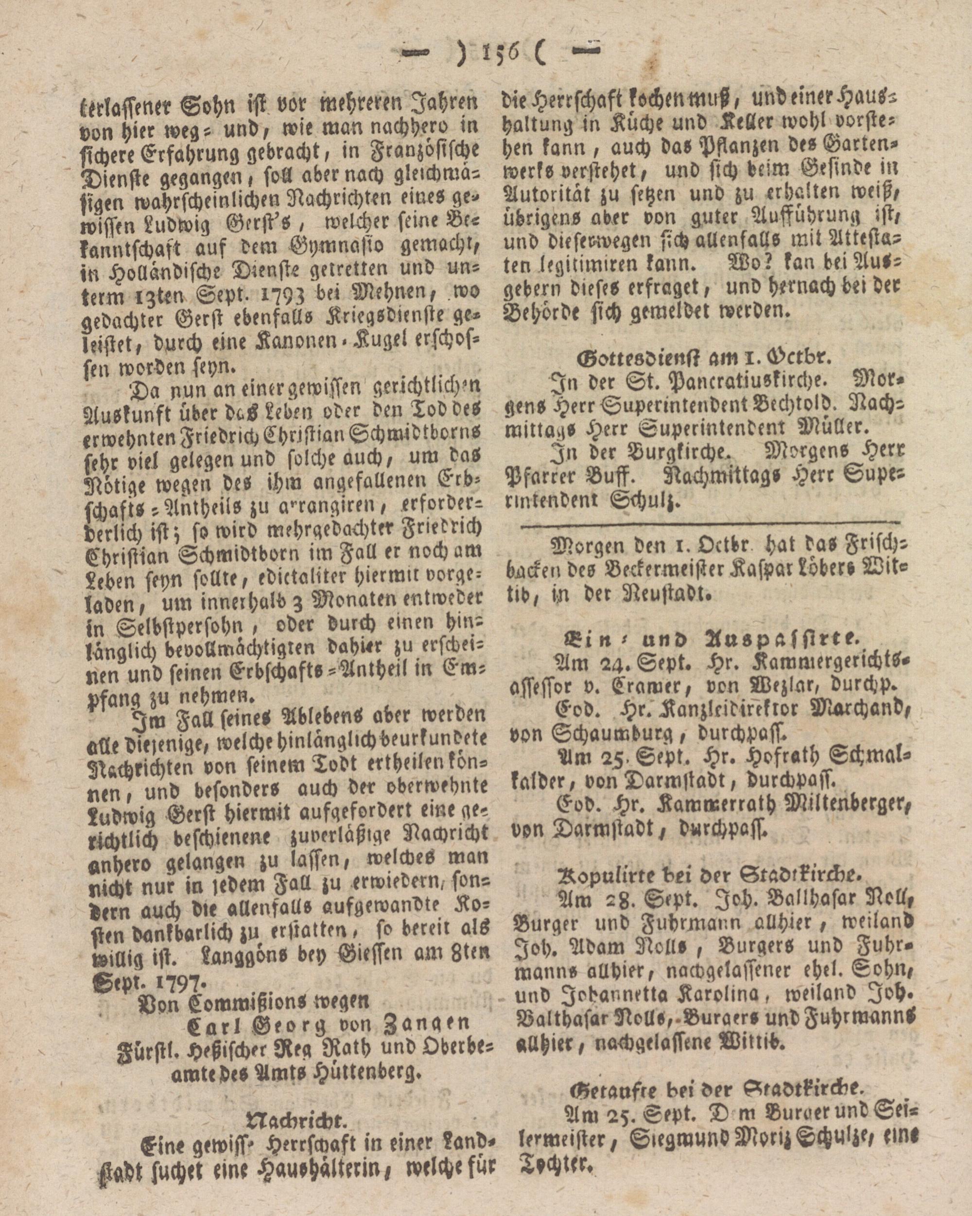 Im Fall seine- Ableben- aber werden alle diejenige, welche hinlänglichbeurkundete Nachrichten von seinem Todt ertheilen können , und besonders auch der oberwehnte Ludwig Gerst hiermit aufqefordert eine ge? richtlich beschienene juverlaßige Nachricht «nhero gelangen zu lassen, welches man nicht nur in jedem Fall zu erwredern, sondern auch Die allenfalls aufgewandte Kosten dankbarlich zu erstatten, so bereit als willig ist. Langgöns bey Giessen am Sten Sept. 1797. ,Ä.