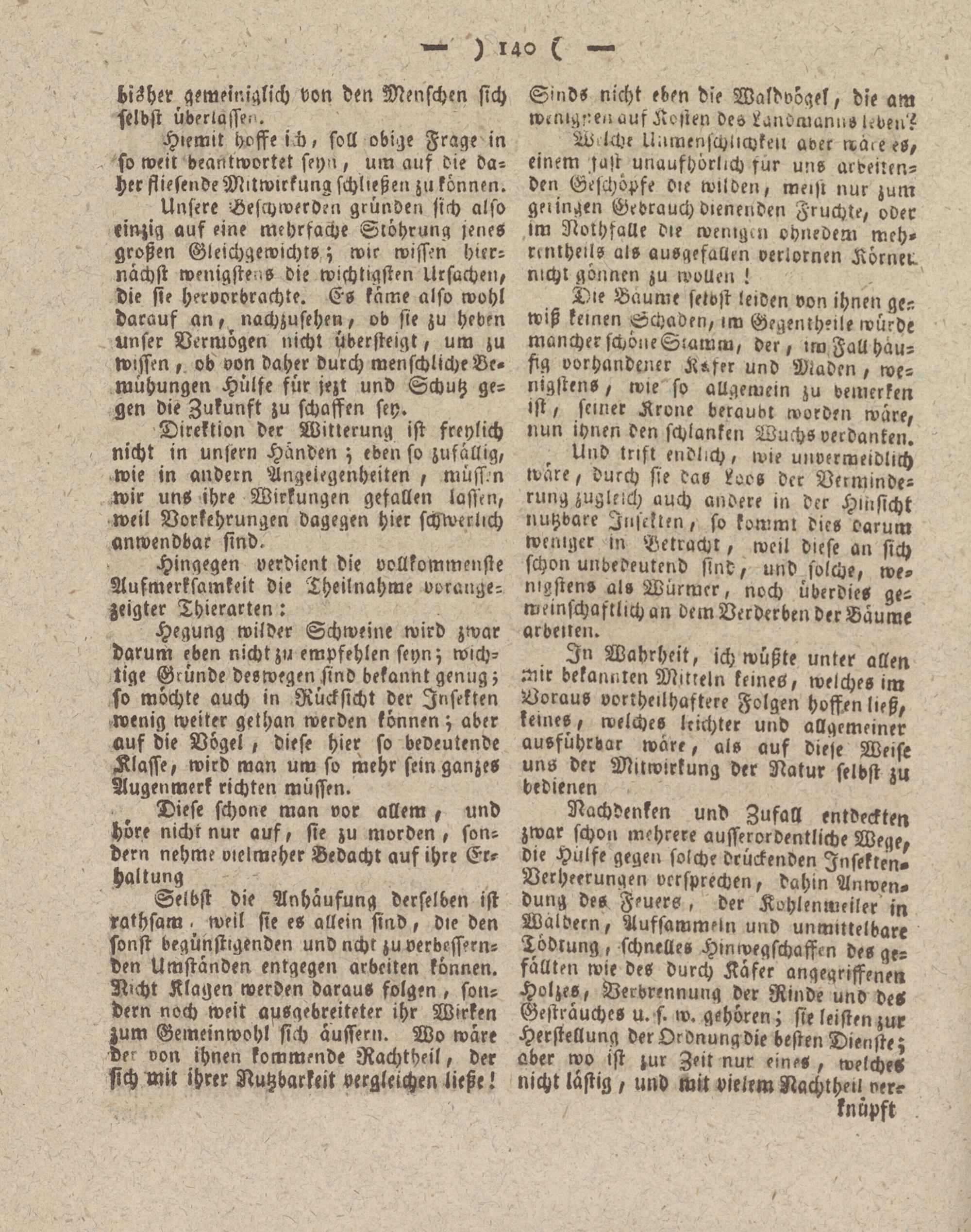 Hegung wilder Schweine wird zwar darum eben nicht zu empfehlen seyn; wichtige Gründe deswegen sind bekannt genug; so möchte auch in Rücksicht der Insekten wenig weiter gethan werden können; aber auf die Vögel , diese hier so bedeutende Klaffe, wird man um so mehr sein ganzes Augenmerk richten müssen.