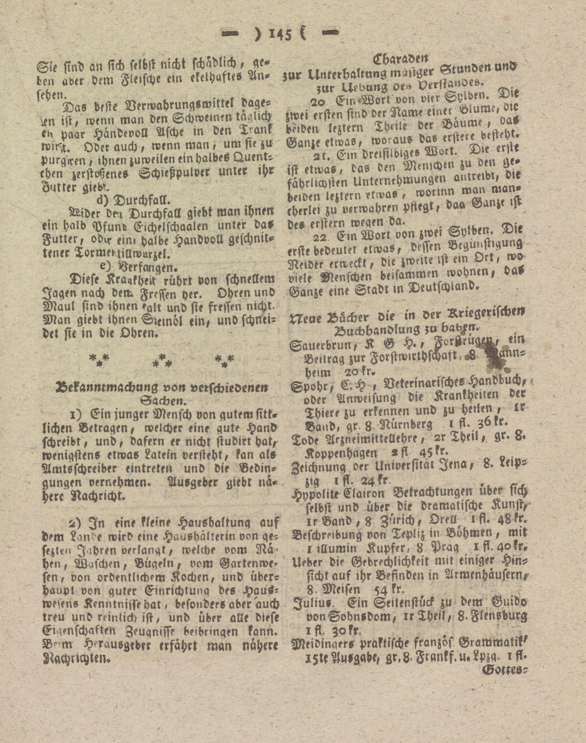 2) In eine kleine Haushaltung auf dem Lande wird eine Haushälterin von qe- seztrn Jahren verlangt, welche vom Nahen, Wäschen, Bügeln, vom Gartenwe- fen, von ordentlich-m Kochen, und überhaupt von guter Einrichtung des Hauswesens Kenntnisse hat, besonders aber "auch treu und reinlich ist, und über alle diese Eigenschaften Zeugnisse beibrinqen kann. B" m Herausgeber erfährt man nähere Nachrichten.