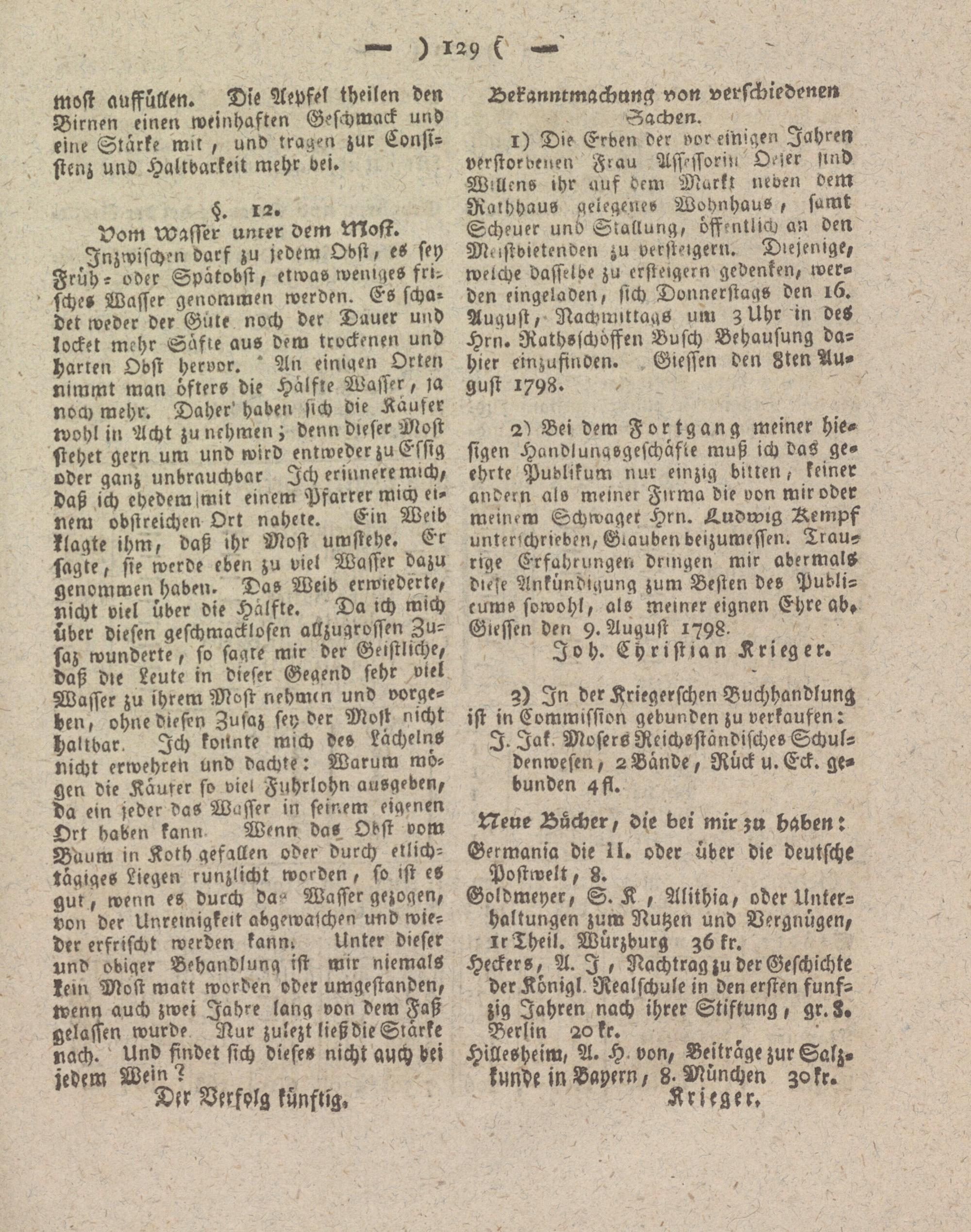 2) In der Kriegerschen Buchhandlung ist in Commission gebunden zu verkaufen: