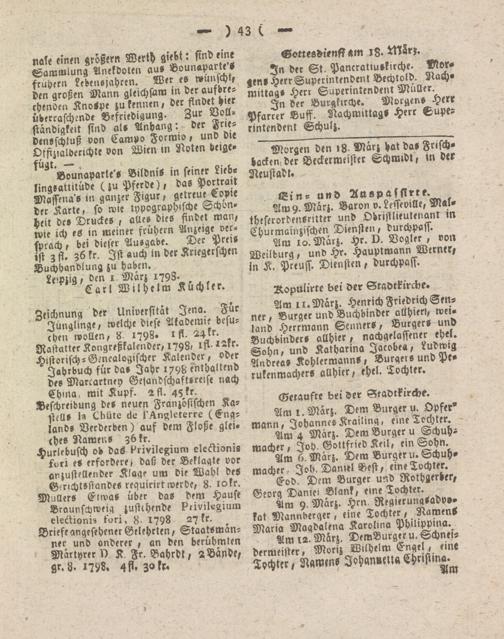 Am n. März. Henrich Friedrich Senner , Burger und Buchbinder allhieri, wer. land Herrmann Senners, Burgers und Buchbinders allhier, nachgelassener ehel. S°hn, und Katharina Jacobe», Ludwig Andreas KohlermannS, Bürge, e und Pt» rukenmachers allhier, ehel. Tochter.