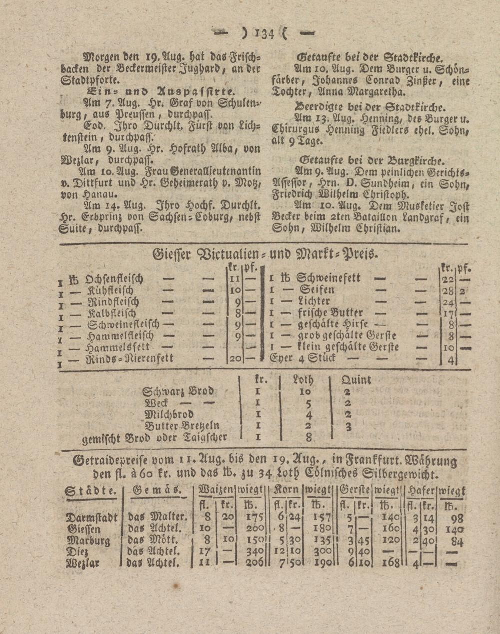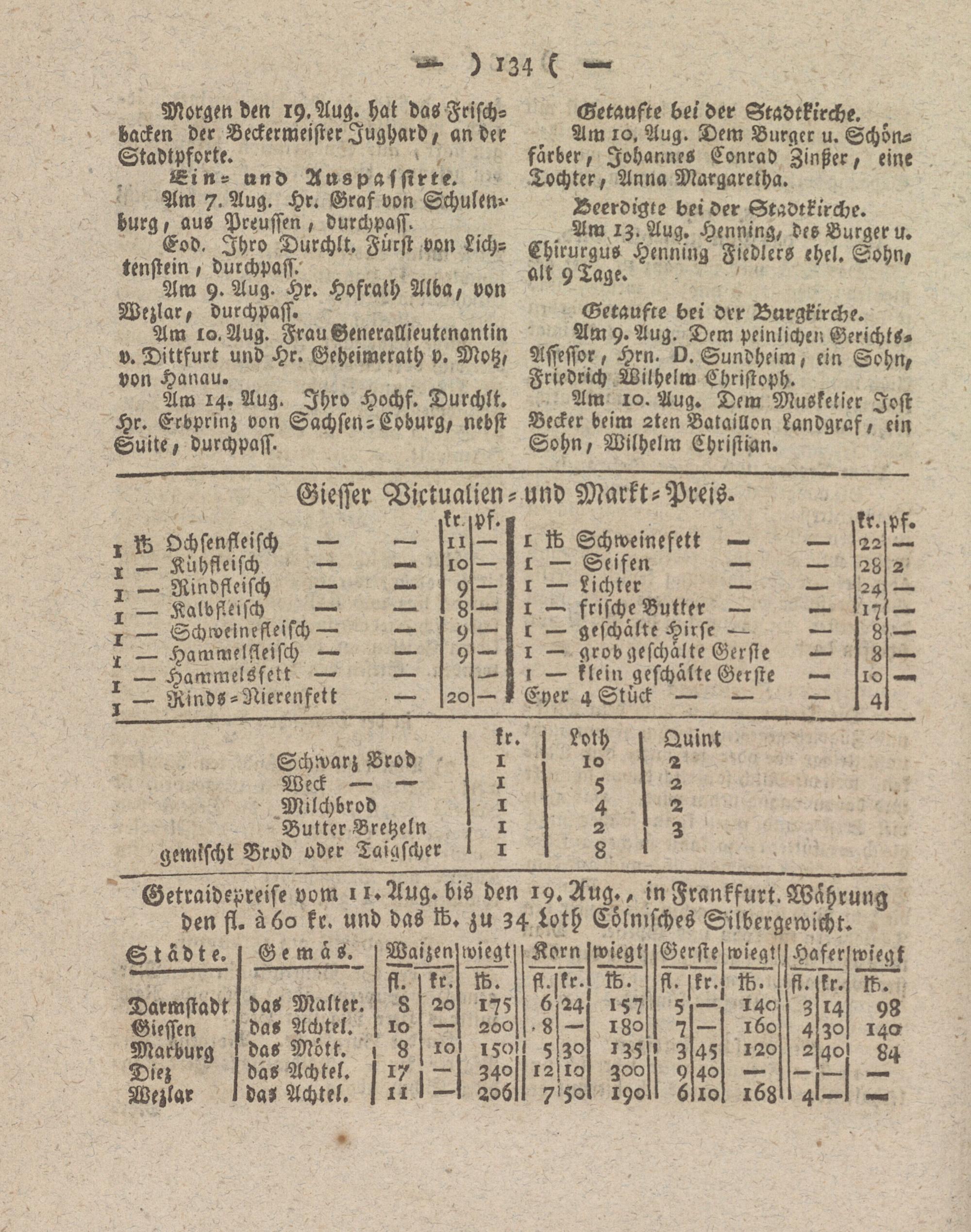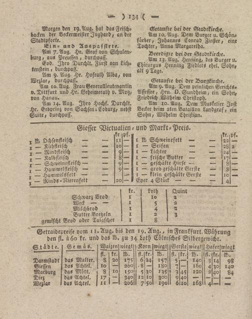 Getraidepreise vom n.Aug. bis den 19.Aug., in Frankfurt. Wahrung den fl. ä6o kr. und das ft. zu 34 koth Cölmsches Silbergewicht.