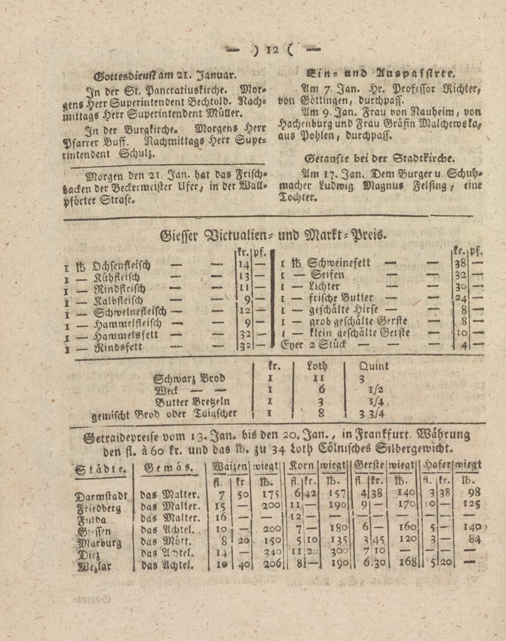 Getraidepreffe vom 13. Ian. bis den 20. Ian., in Frankfurt. Wahrung den fl. ä6o kr. und das ft. zu 34 toth Cölnisches Sübergewicht.