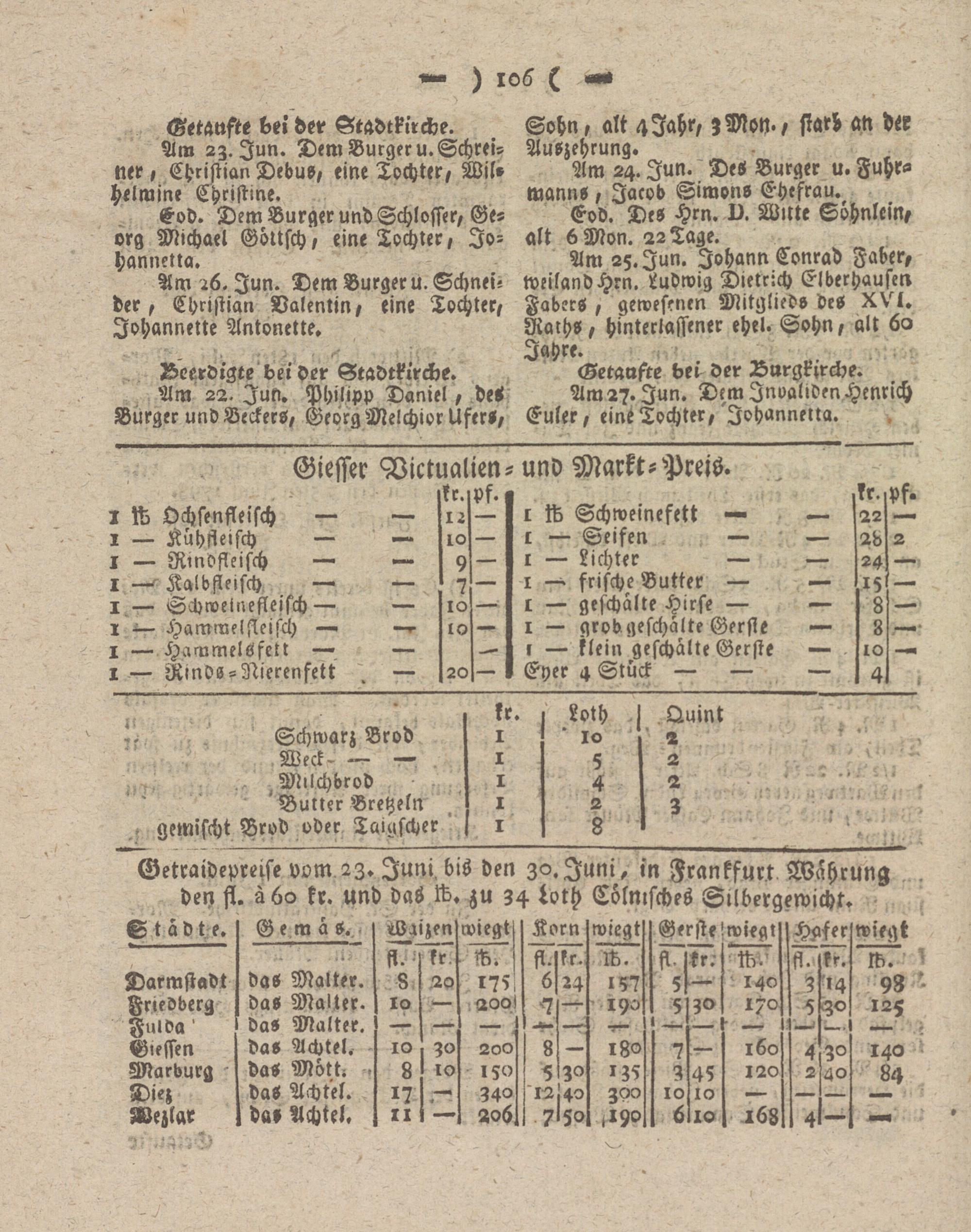 Getraidepresse vom 23. Juni, bis den 30.Juni, in Frankfurt Währung den fl. ä6o kr. und das ft. zu 34 Loth Cölnrsches Silbergewicht.