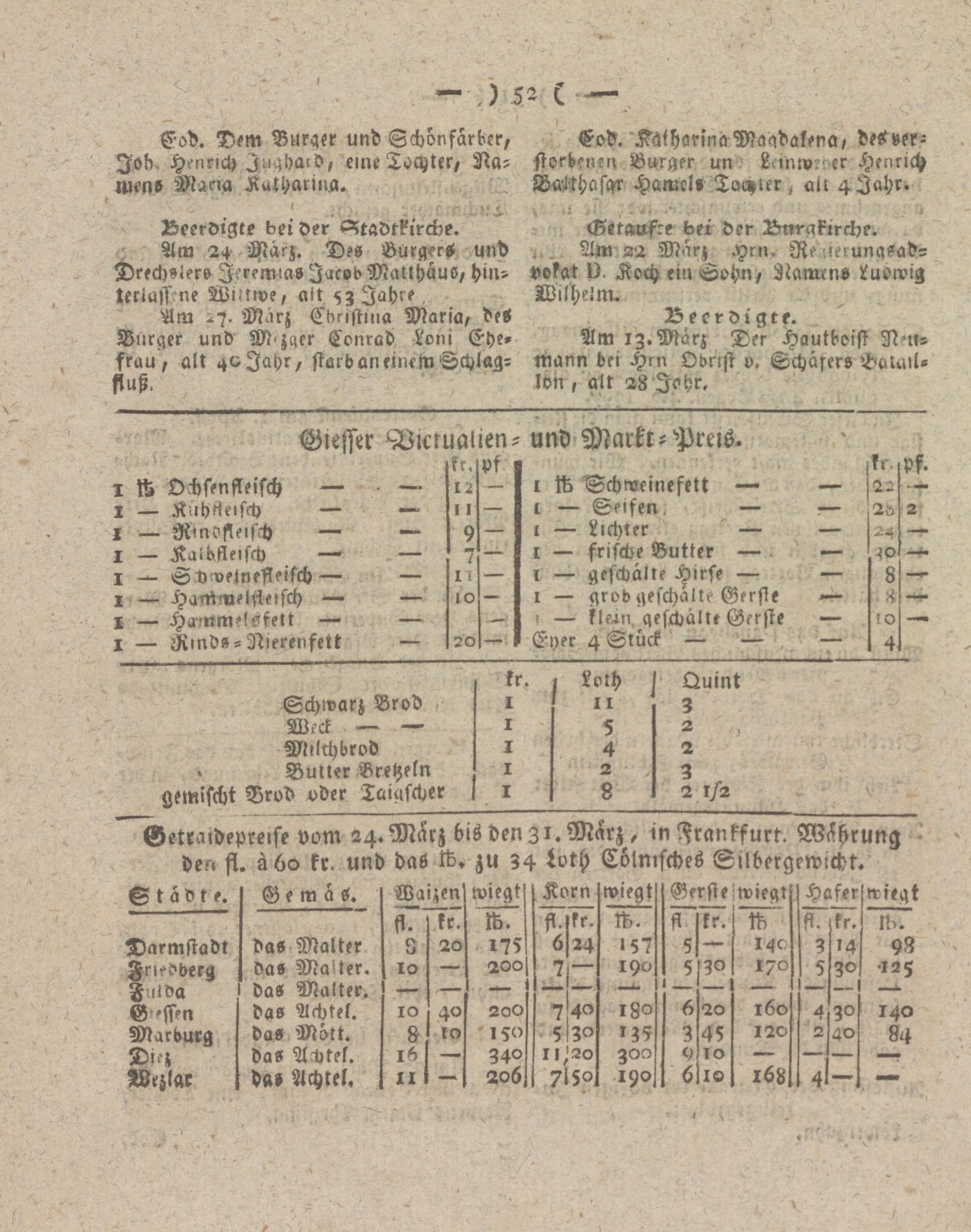 Getracheprelse vom 24. Marz bis den Z i. Marz, in Frankfurt. Währung den fl. ä 60 kr. und daö ft. zu 34 töth Cölnisches Silbergewicht.