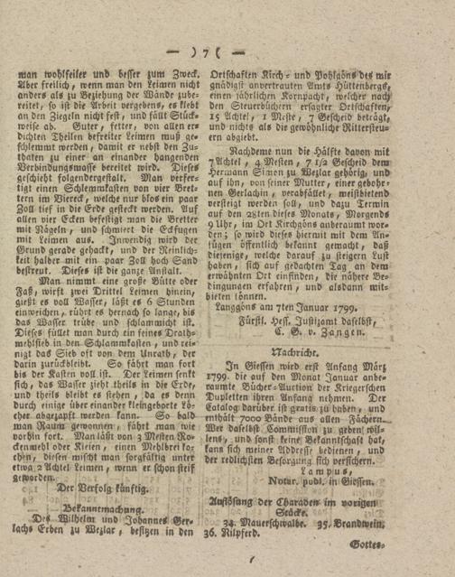 In Giessen wird erst Anfang März 1799- die auf den Monat Januar anberaumte Bücher-Auktion der Kriegerfchen Dupletten ihren Anfang nehmen. Der Catalog darüber ist gratis zu haben, und enthält 7000 Bände aus allen Fächern... Wer daselbst Commission zu geben" willens, und sonst keine Bekanntschaft hat, kann sich meiner Address? bedienen , und der redlichsten Besorgung sich versichern.