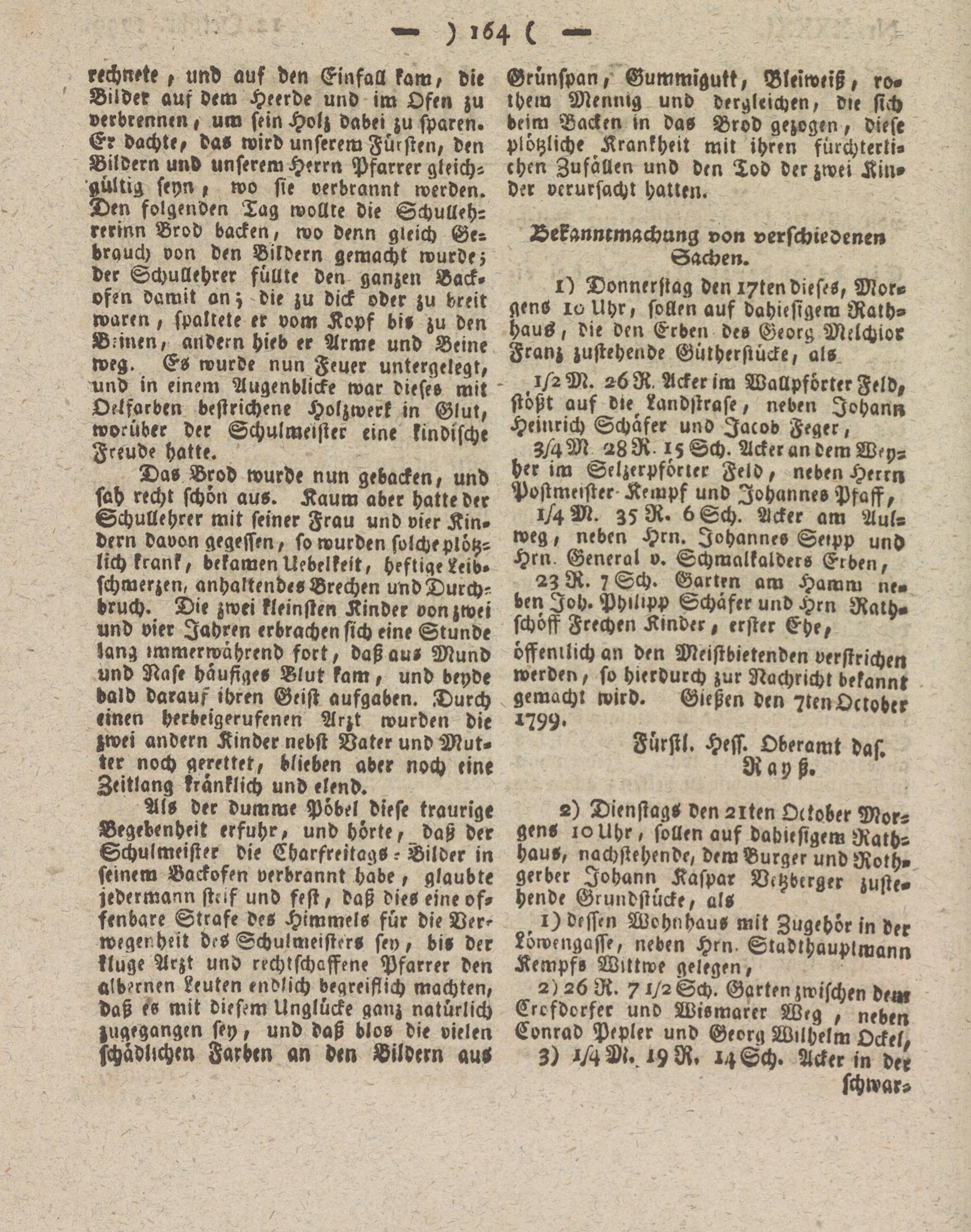 Das Brod wurde nun gebacken, und sah recht schön aus. Kaum aber hatte der Schullehrer mit seiner Frau und vier Kindern davon gegessen, so wurden solcheplötz- lich krank, bekamen Uebelkeit, heftige Leib- schmerzen, anhaltendes Brechen und Durchbruch. Die zwei kleinsten Kinder von zwei und vier Jahren erbrachen sich eine Stunde Lang immerwährend fort, daß aus Mund und Nase häufiges Blut kam, und beyde bald darauf ihren Geist aufgaben. Durch einen herbeigerufenen Arzt wurden die zwei andern Kinder nebst Vater und Mutter noch gerettet, blieben aber noch eine Zeitlang kränklich und elend.