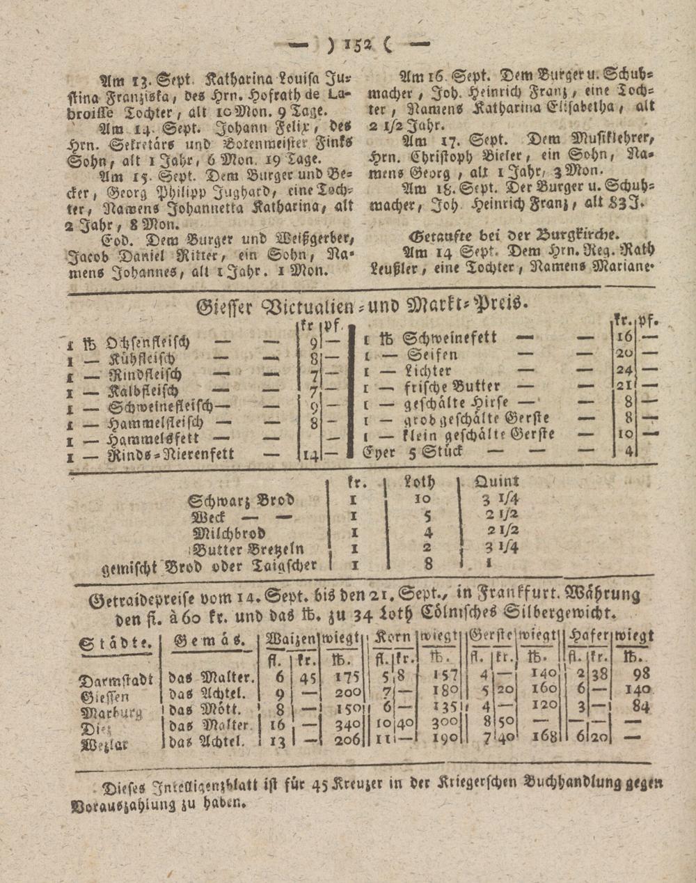 Getraidepreise vom la.Sept. bis den^r.Sept., in Frankfurt. Wahrung den fi. ä6o kr. und das ft. zu 34 ^oth Cölnssches Silbergewicht.