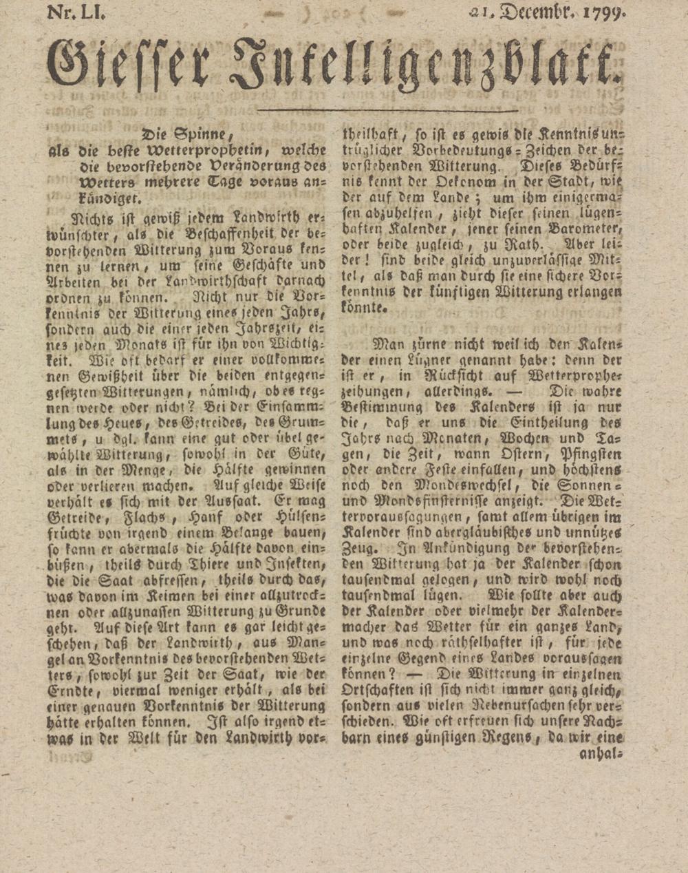 Man zürne nicht weil ich den Kalender einen Lügner genannt habe: denn der ist er , in Rücksicht auf Wetterprophe- zeihungen, allerdings. — Die wahre Bestimmung des Kalenders ist ja nur die, daß er uns die Eintheilung des Jahrs nach Monaten, Wochen und Tagen, die Zeit, wann Ostern, Pfingsten oder andere Feste einfallen, und höchstens noch den Mondeswechsel, die Sonnen - und Mondsfinsterniffe anzeigt. DieWet- tervoraussagungen, samt allem übrigen im Kalender sind adergläubistheS und unnützes Zeug. In Ankündigung de»- bevorstehenden Witterung hat ja der Kalender schon tausendmal gelogen, und wird wohl noch tausendmal lügen. Wie sollte aber auch der Kalender oder vielmehr der Kalenvermacher das Wetter für ein ganzes Land, und was noch rathfelhafter ist, für jede einzelne Gegend eines Landes voraussagen können? —ü Die Witterung in einzelnen Ortschaften ist sich nicht immer ganz gleich, sondern aus vielen Nebenursachen sehr verschieden. Wie oft erfreuen sich unsere Nachbarn eine- günstigen Regen-, da wir eine anhal-