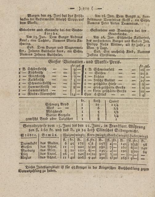 Getraidepreise vom 15.Juni bis den 22.Juni, in Frankfurt. Währung den si. ä6o kr. und das ft. zu 34 Loth Cölmsches Silbergewicht. J Städte.