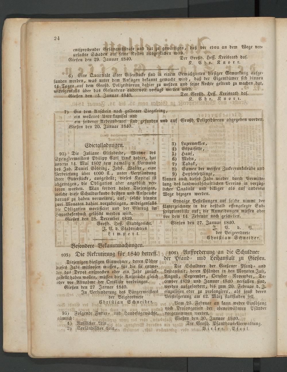 Die Schuldner der Gießener Pfand- und Leihanstalt, deren Pfänder in den Monaten Juli, August, September, Oktober. November, December 1839 und Januar 1840 verfallen sind, werden aufgefordert, bis zum 20. Februar d. I. einzulösen oder zu prolongiren, als sonst deren Versteigerung am 12. März stattfinden soll.