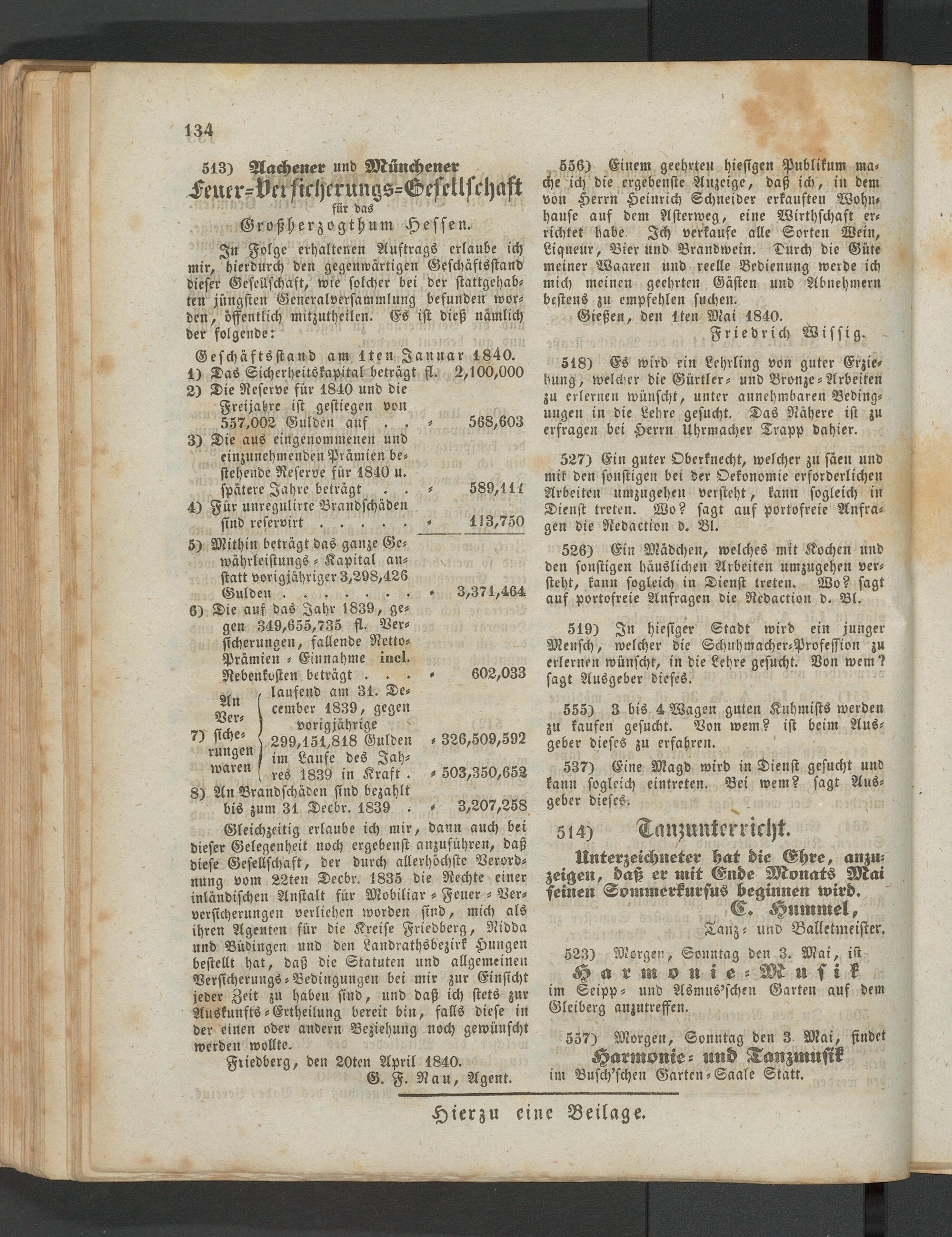 Gleichzeitig erlaube ich mir, dann auch bei dieser Gelegenheit noch ergebenst anzuführen, daß diese Gesellschaft, der durch allerhöchste Verordnung vom 22ten Decbr. 1835 die Rechte einer inländischen Anstalt für Mobiliar - Feuer - Ver- vcrsicherungen verliehen worden sind, mich als ihren Agenten für die Kreise Friedberg, Nidda und Büdingen und den Landrathsbezirk Hungen bestellt hat, daß die Statuten und allgemeinen Bersicherungs-Bedingungen bei mir zur Einsicht jeder Zeit zu haben sind, und daß ich stets zur Auskunsts-Ertheilung bereit bin, falls diese in der einen oder andern Beziehung noch gewünscht werden wollte.