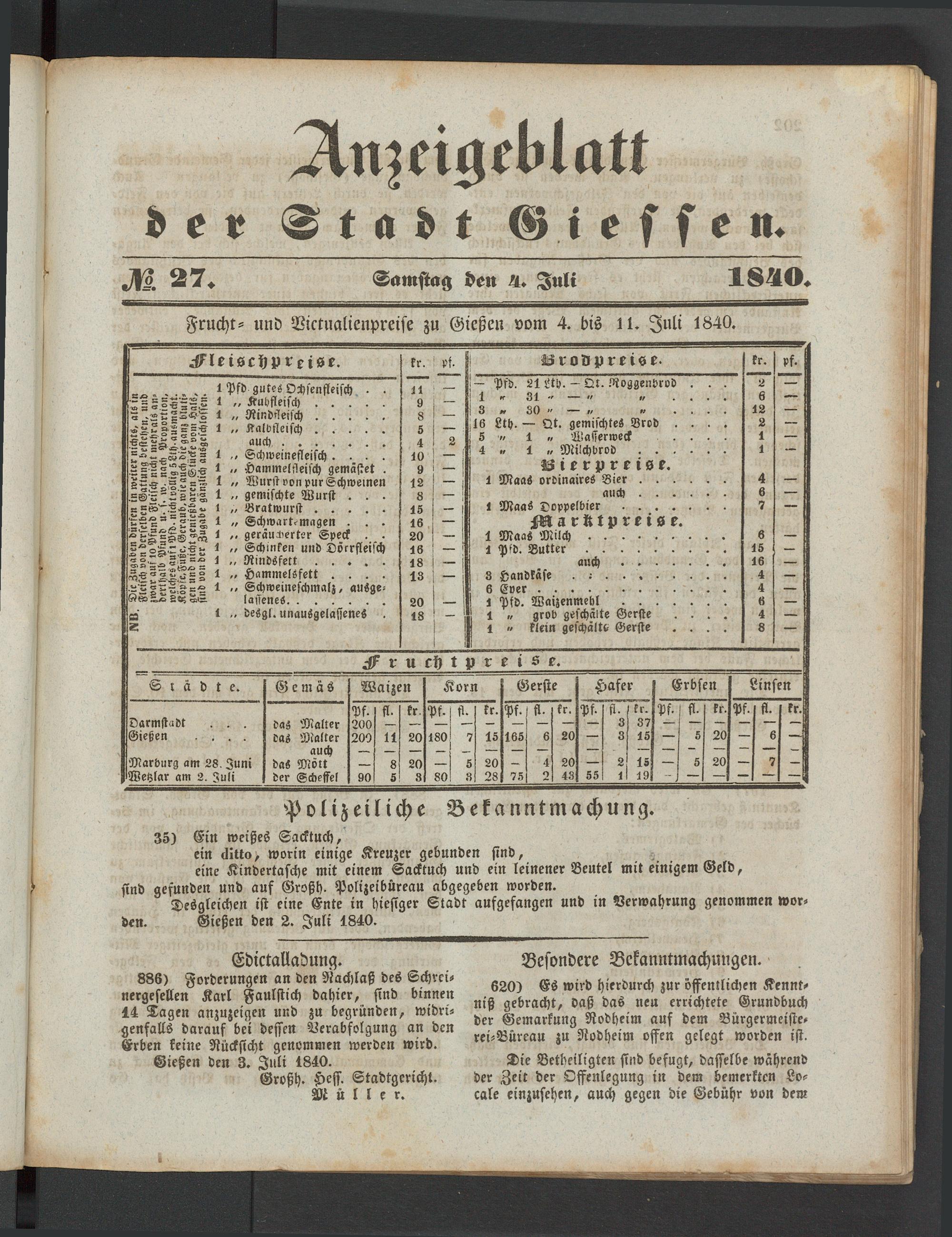 Frucht- und Vrctualienpreise zu Gießen vom 4. bis 11. Juli 1840.