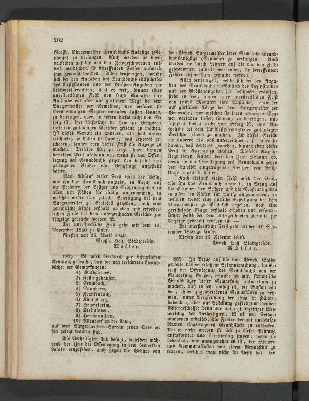3) Crumbach, 4) Naunheim, 5) Frankenbach, 6) Königsberg, 7) Heuchelheim, 8) Kleinlinden, 9) Hermannftein, 10) Allendorf an der Lahn, auf dem Bürgermeisterei-Bureau jeden Orts offen gelegt worden sind.