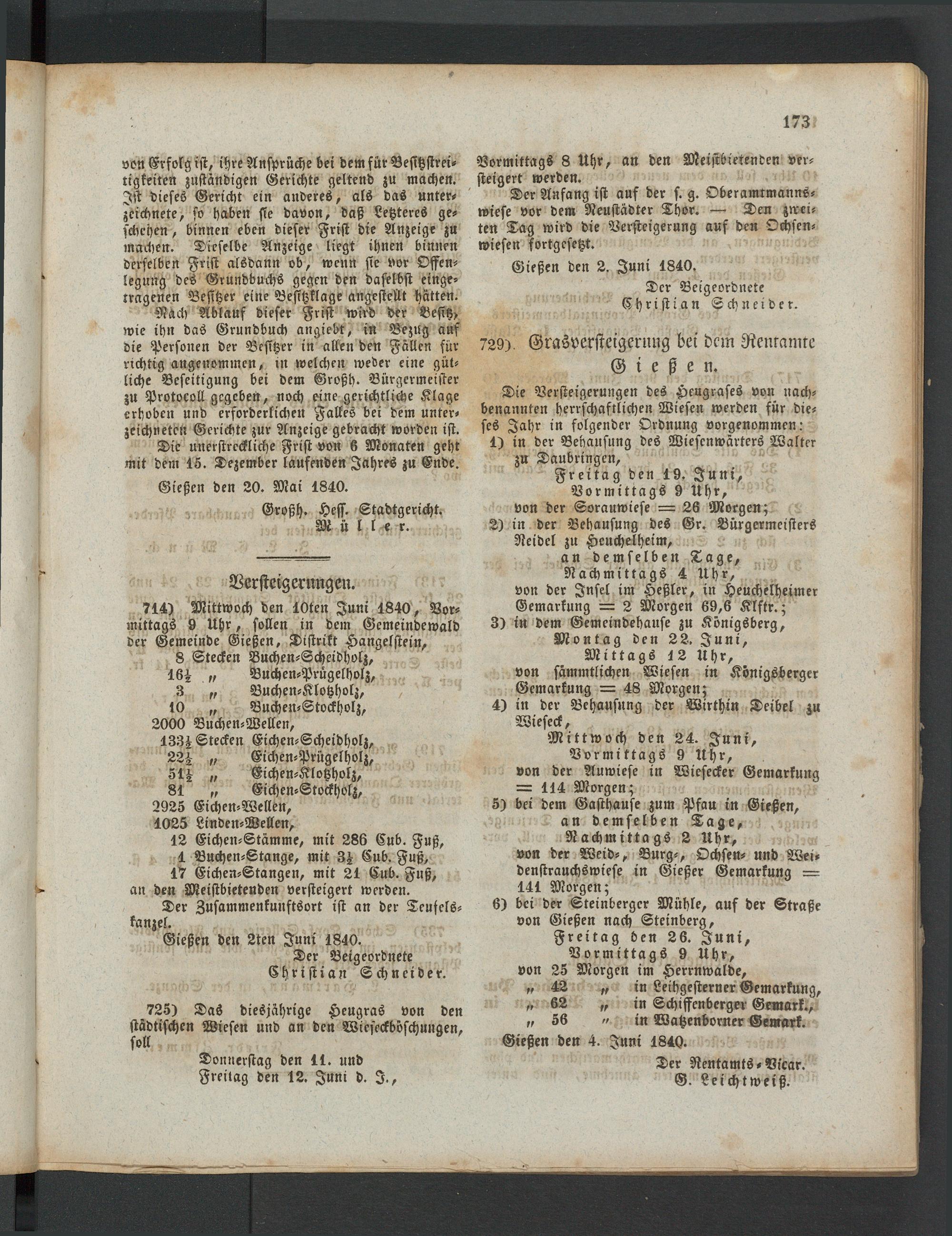 714) Mittwoch den 10ten Juni 1840, Vormittags 9 Uhr, sollen in dem Gemeindewald der Gemeinde Gießen, Distrikt Hangelstein,