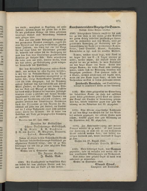 Indem ich obigen dritten Rechenschafts-Bericht der Berliner Lebens-Versicherungs-Gesellschaft zur allgemeinen Kenntniß bringe, lade ich zu Versicherungen ein und bin zu jeder möglichen Auskunft gerne bereit.
