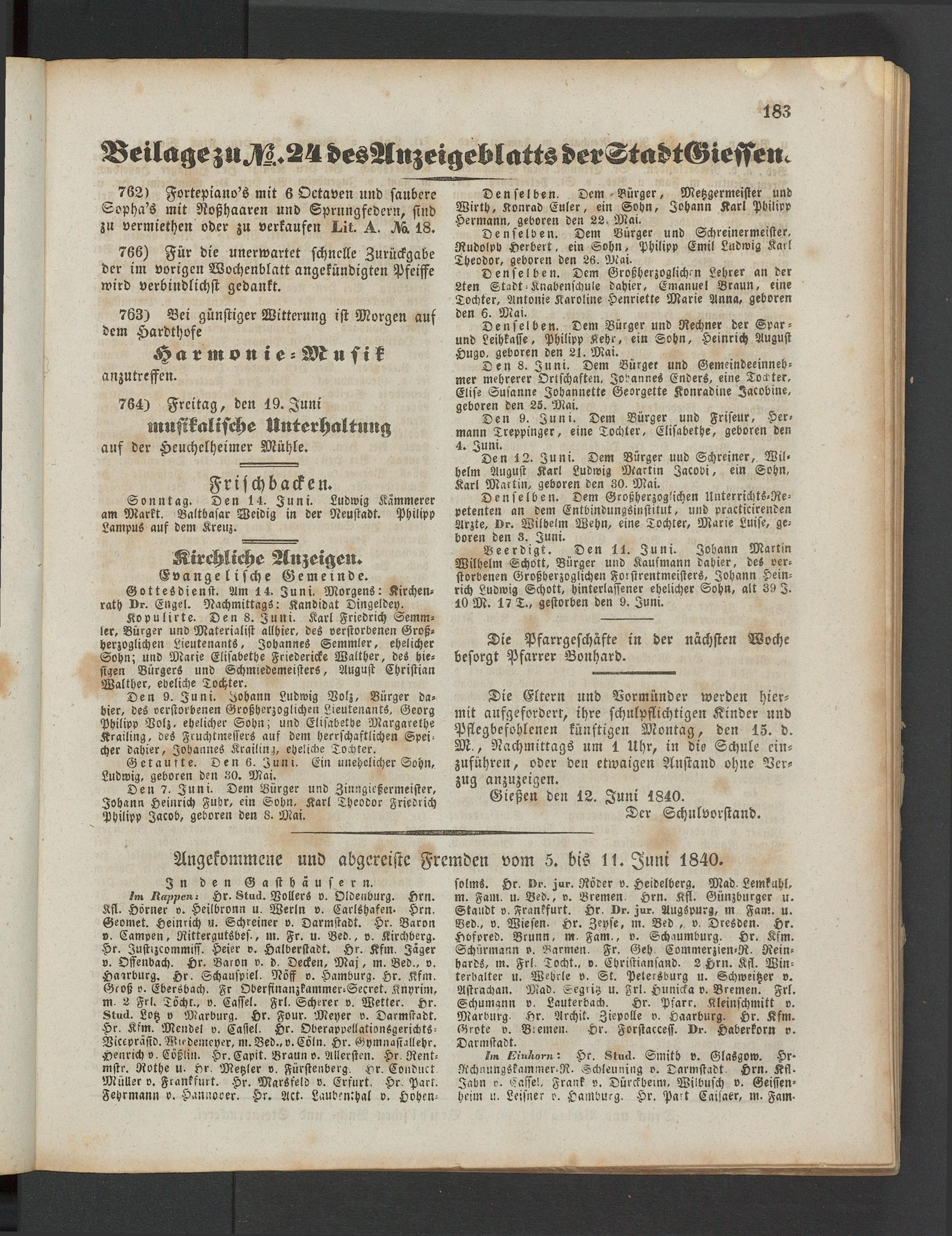 Angekommene und abgereiste Fremden vom 5. bis 11. Juni 1840.