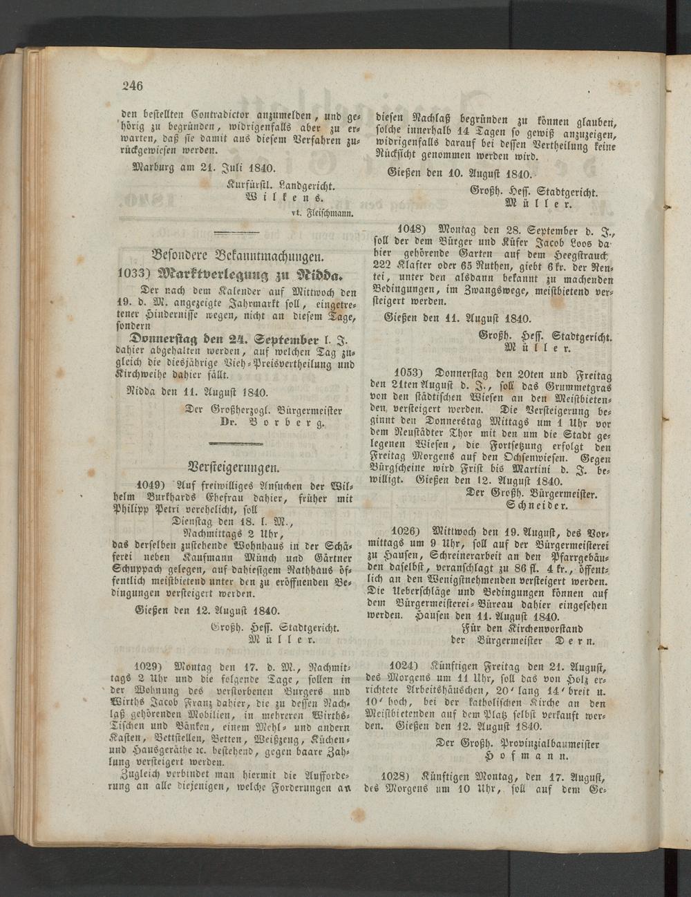 1024) Künftigen Freitag den 21. August, des Morgens um 11 Uhr, soll das von Holz errichtete Arbeitshäuschen, 20^ lang 14' breit u. 10' hoch, bei der katholischen Kirche an den Meistbietenden auf dem Platz selbst verkauft werden. Gießen den 12. August 1840.