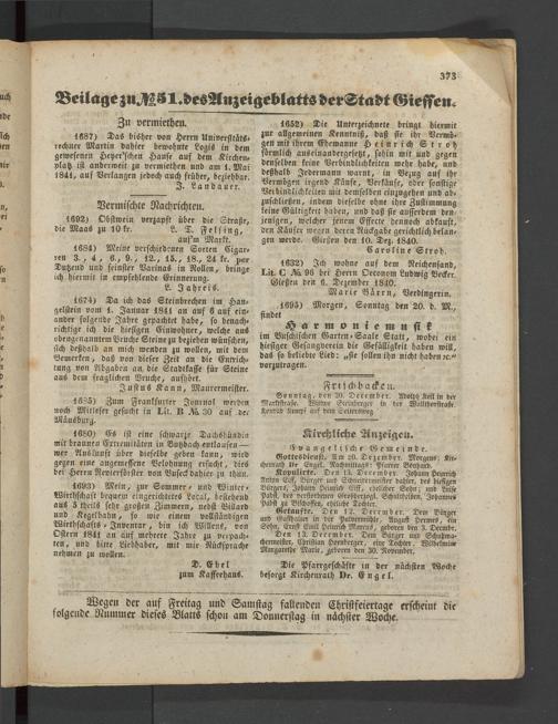 Kopulirte. Den 13. December. Johann Heinrich Anton Eiff, Bürger und Schneidermeister' dahier, des hiesigen Bürgers, Johann Heinrich Eiff, ehelicher Sohn; und Luise Pabst, des verstorbenen Großherzogl. Schultheißen/ Johannes Pabst zu Bischoffen, eheliche Tochter.